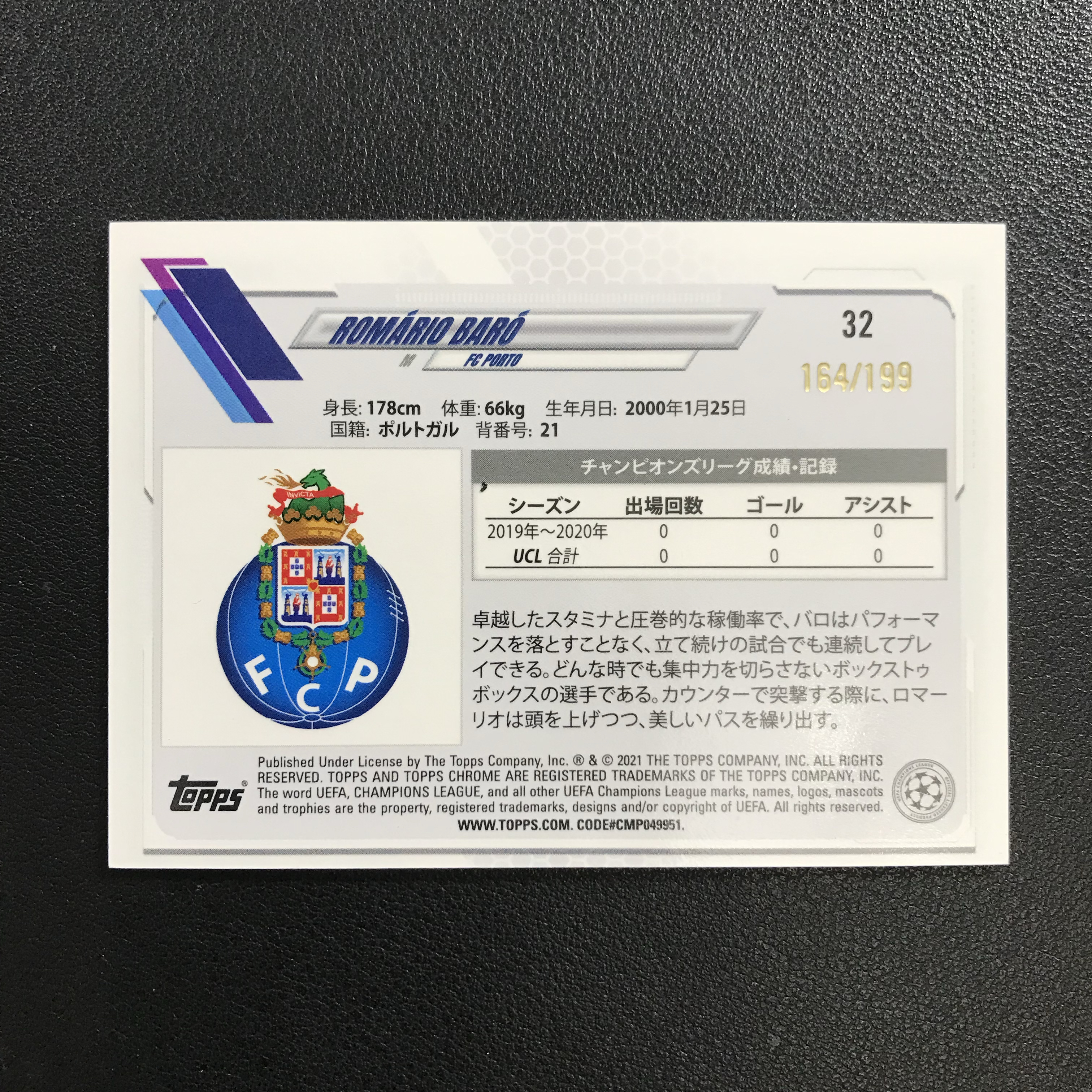 2020-21 Topps 樱花 Romário Baró RC 罗马里奥 巴罗 葡萄牙 波尔图 新秀 欧冠 TC 199编 青迷宫折 Mojo折 日版 樱花版 轻印如图 极光