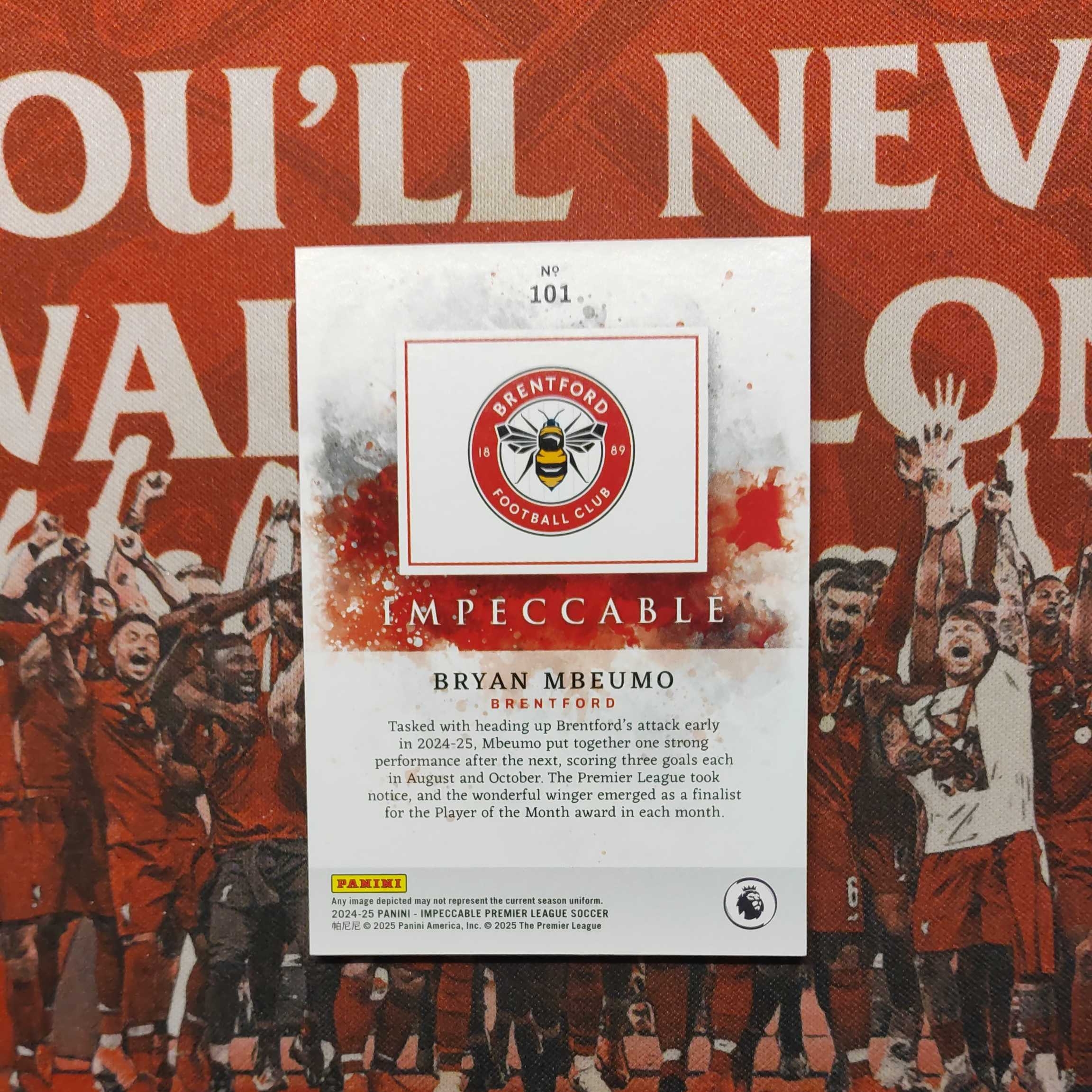 2024-25 Panini Impeccable Bryan Mbeumo 利记小铺 英超小真金国际版 曼联 姆贝乌莫 红平行 02/15 低编 卡品如图 已转会曼联 喀麦隆 前锋 收藏必备