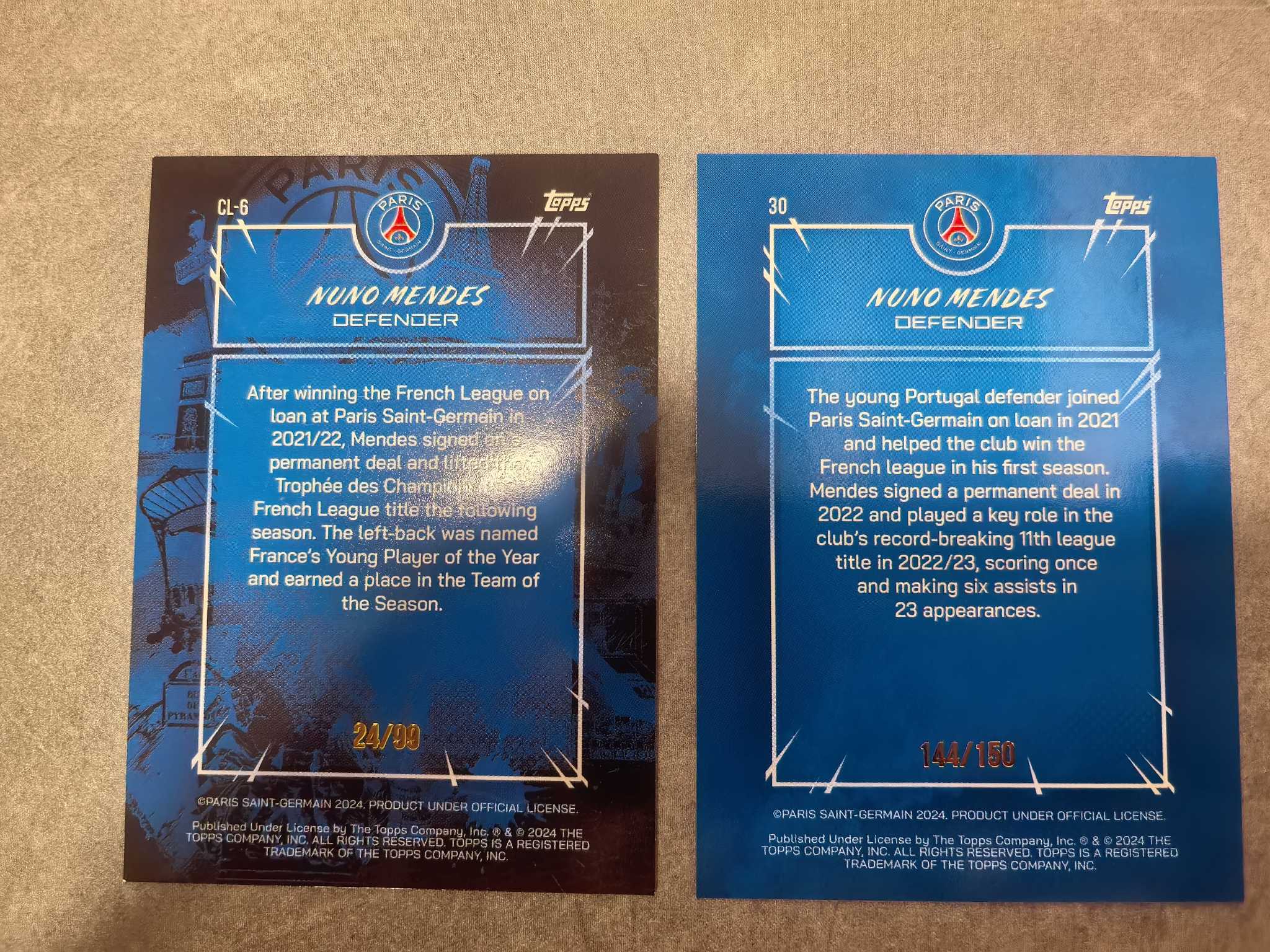 2024 Topps Futera Unique Nuno Mendes 2024 巴黎 葡萄牙 努诺门德斯 世一卫24/99编144/150编(未来可期)