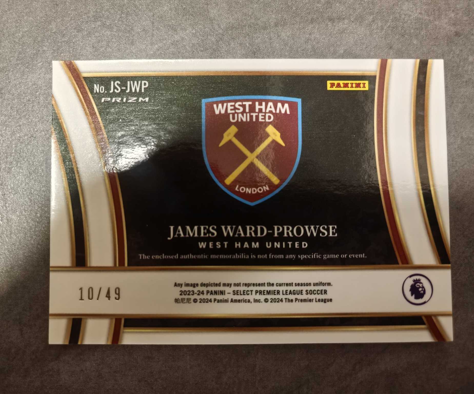 2023-24 Panini Select James Ward Prowse 英格兰 西汉姆联 任意球大师 沃德 普劳斯 10/49编+红色球衣切割,紫红+紫红。