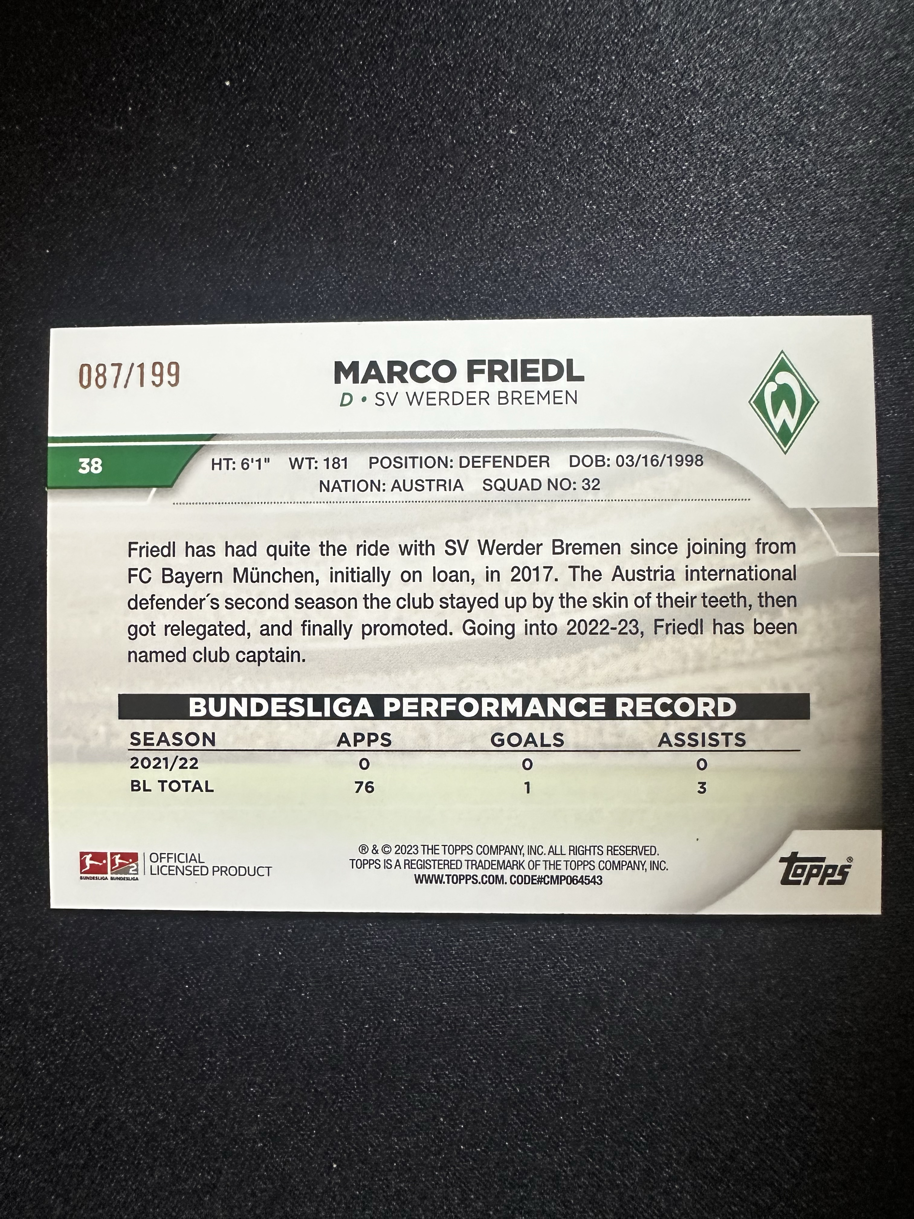 2022-23 Topps Bundesliga Marco Friedl 德甲碧玉 沃尔夫斯堡 马可 弗里德尔 199编 卡片精美 收藏必备 刺客-落枫