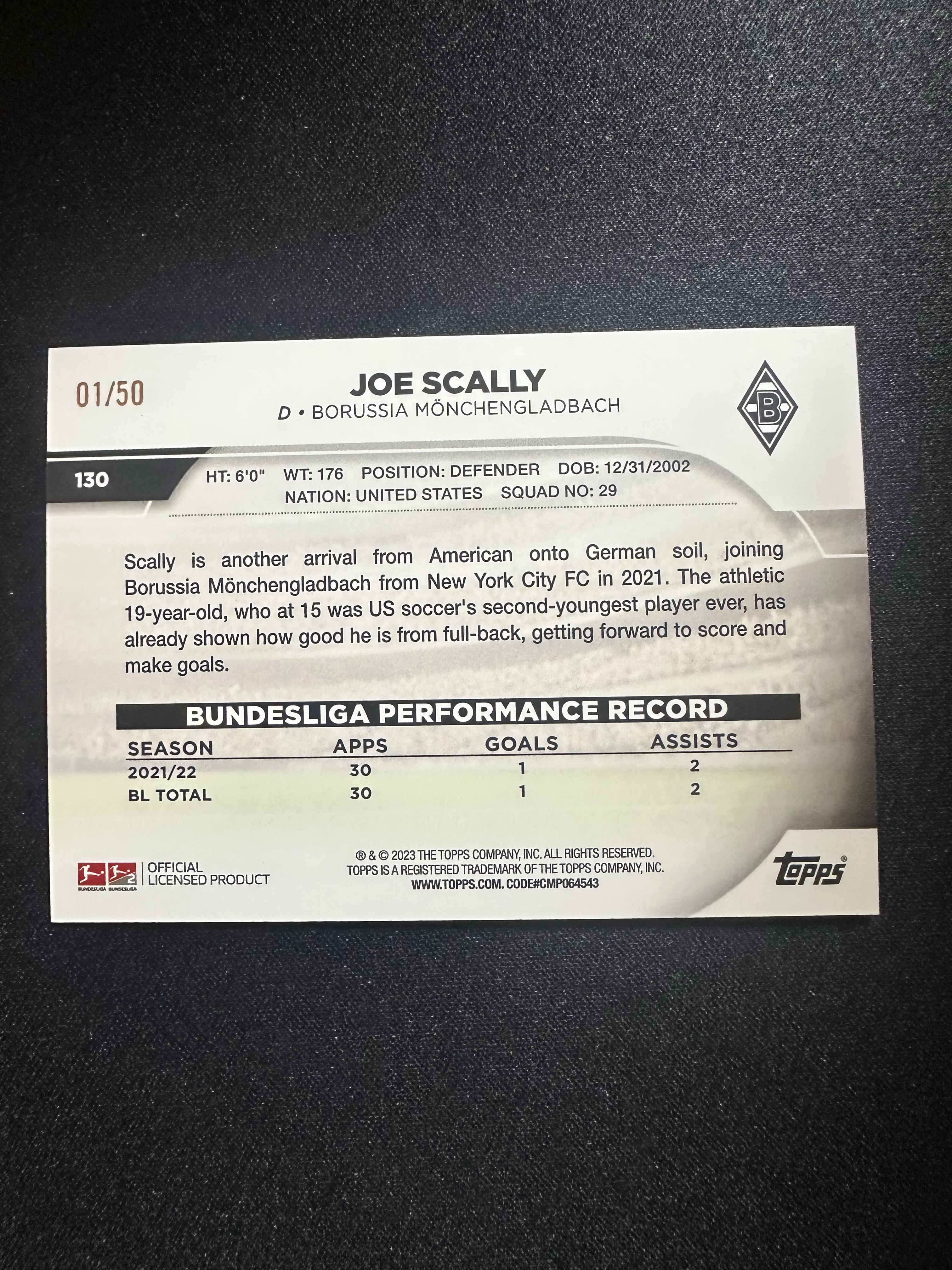 2022-23 Topps Bundesliga Joe Scally 德甲碧玉 门兴 乔 斯卡利 50编 卡片精美 收藏必备 刺客-落枫