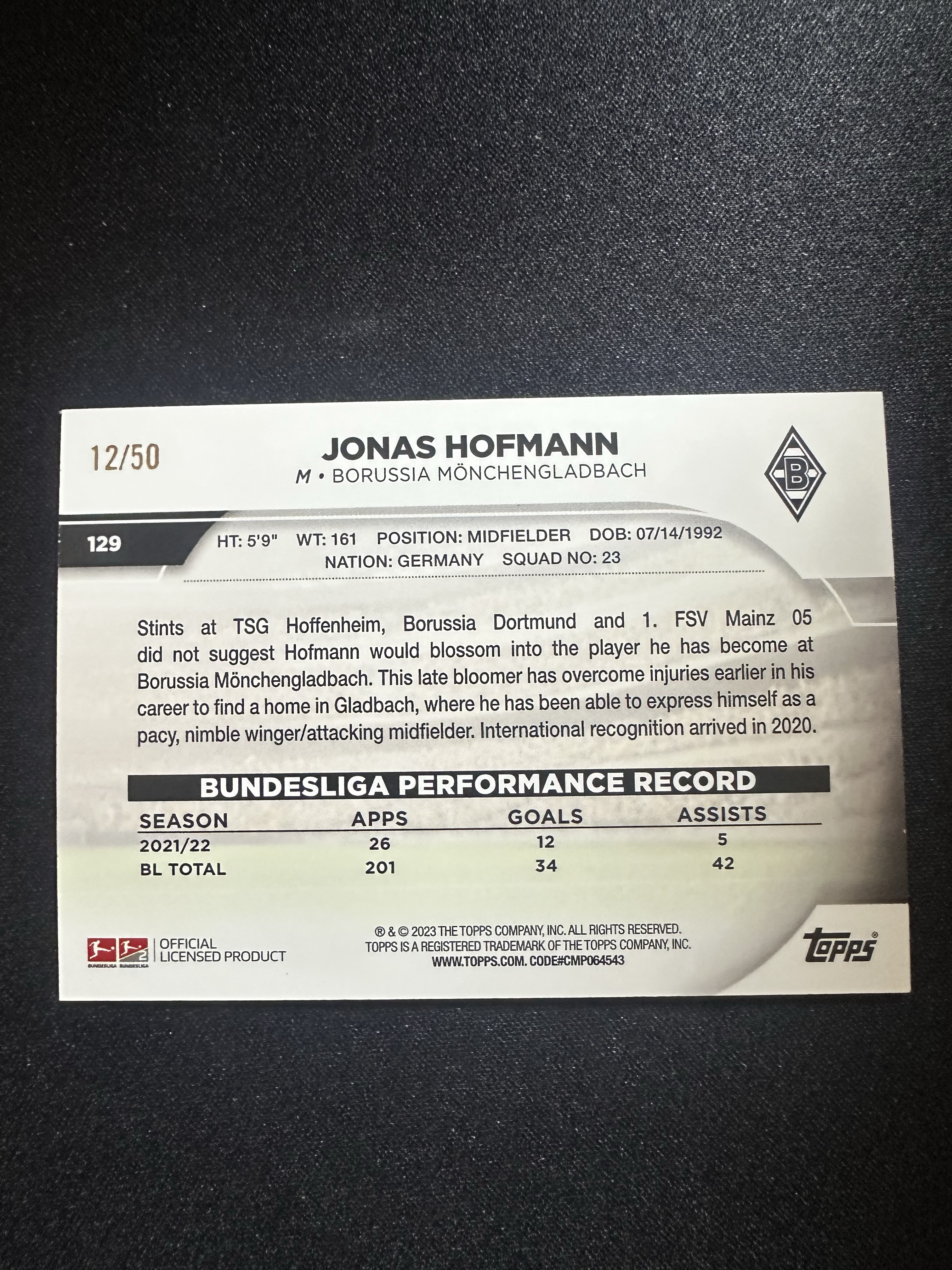 2022-23 Topps Bundesliga Jonas Hofmann 德甲碧玉 门兴 霍夫曼 50编 卡片精美 收藏必备 刺客-落枫