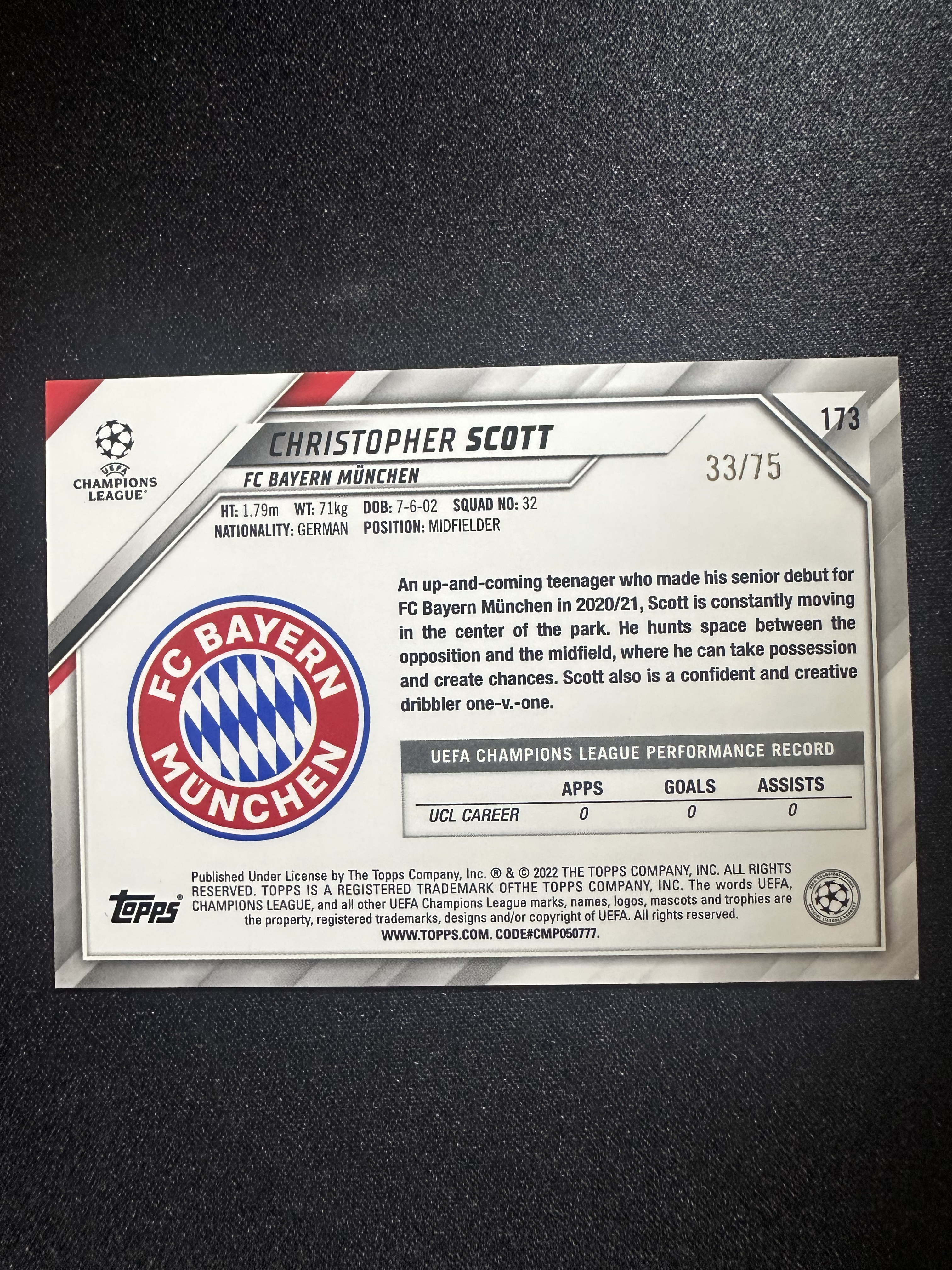 2021-22 Topps UEFA Champions League Christopher Scott RC 欧冠碧玉 拜仁慕尼黑 斯科特 新秀 75编 卡片精美 收藏必备 刺客-落枫