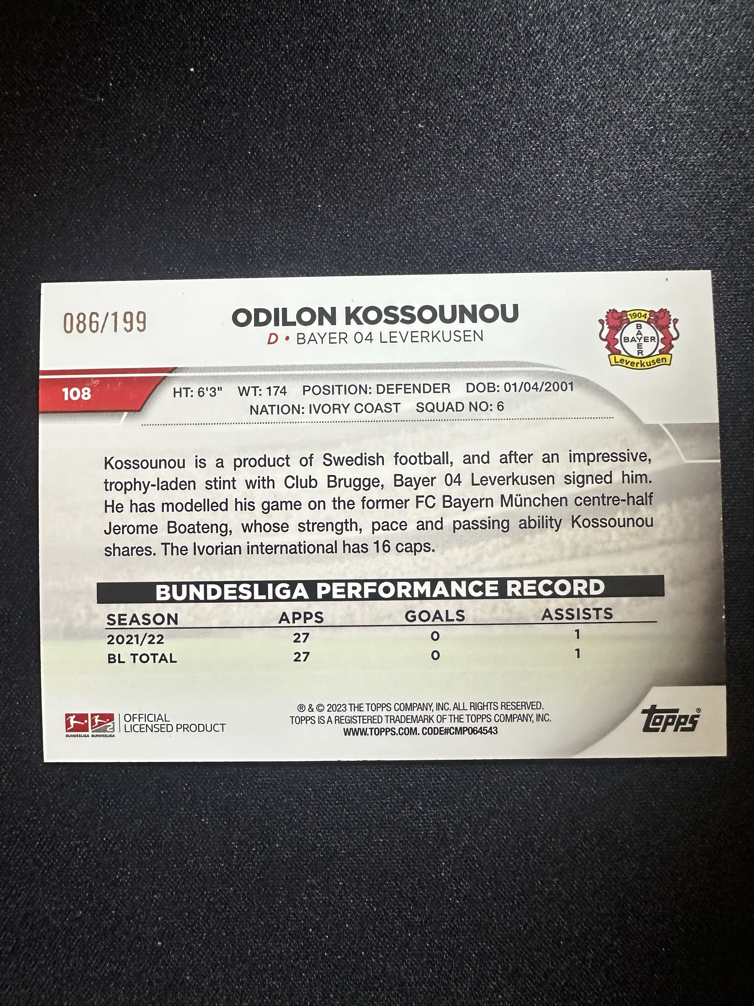2022-23 Topps Bundesliga Odilon Kossounou 德甲碧玉 勒沃库森 科索努 199编 卡片精美 收藏必备 刺客-落枫