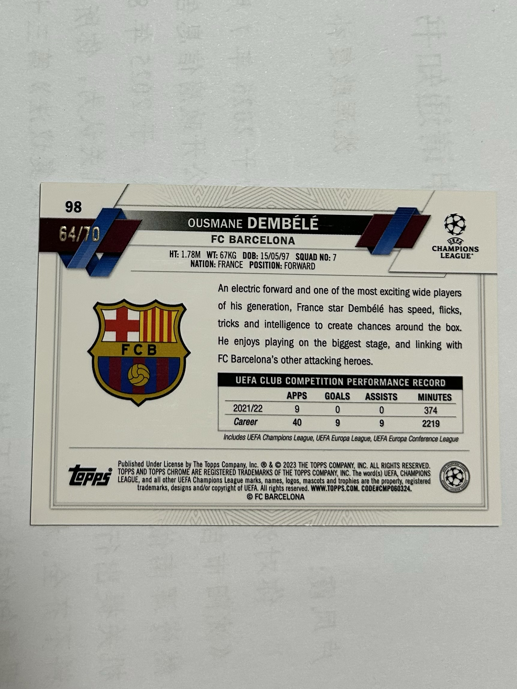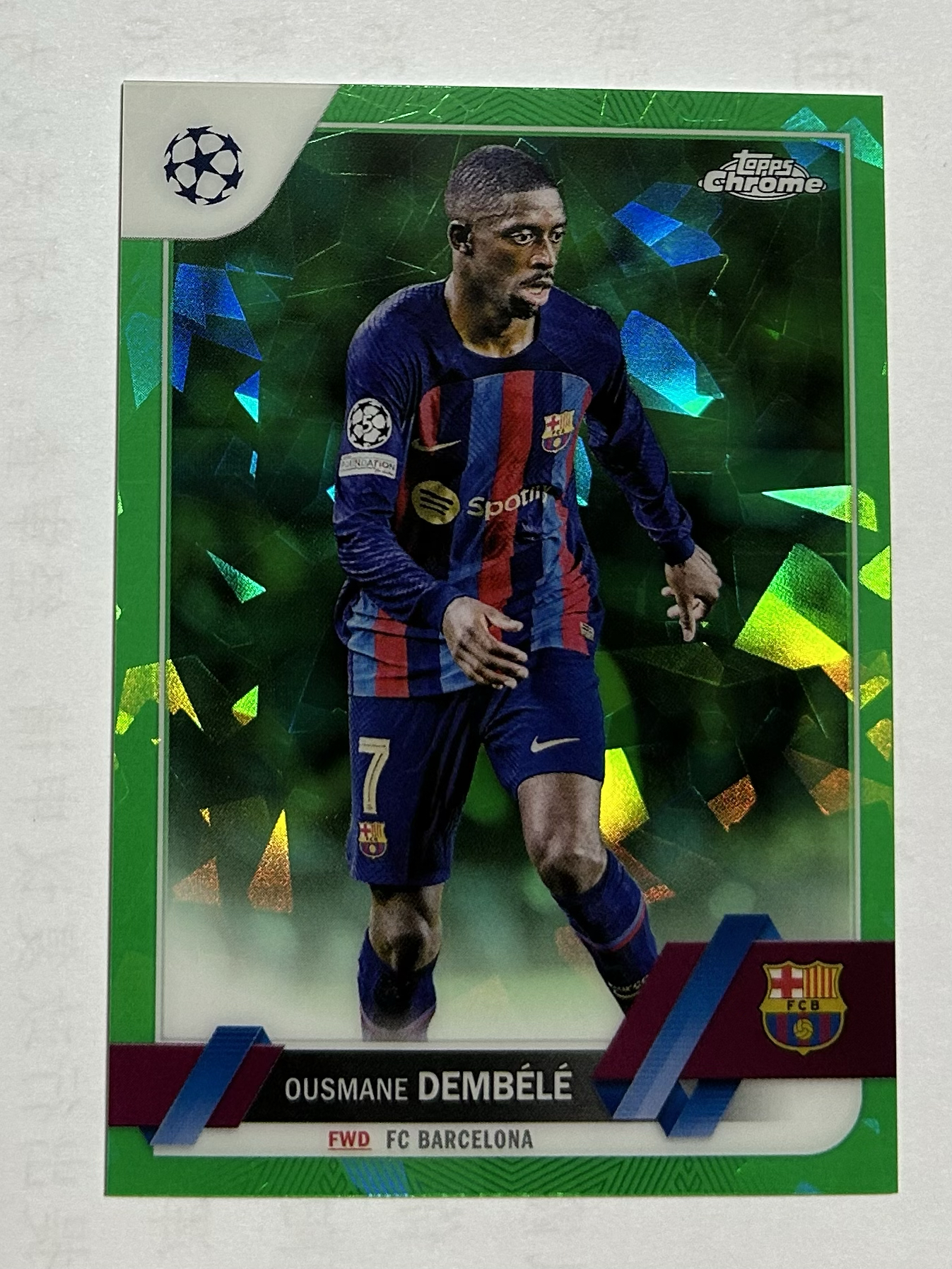 2022-23 Topps Chrome Ousmane Dembélé 欧冠 蓝宝石 Sapphire 登贝莱 大巴黎 /70编 绿碎冰折 巴萨 金球奖获得者 力压亚马尔