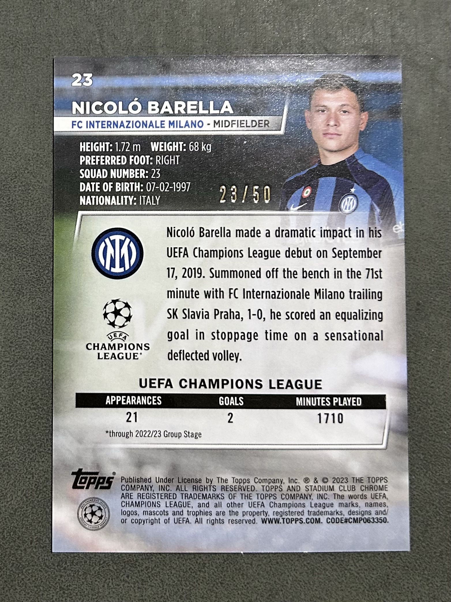 2022-23 Topps Stadium Club Chrome Nicolò Barella 尼科洛 巴雷拉 同背 23/50编 意大利 国际米兰 欧冠 竞技场 金折 折射