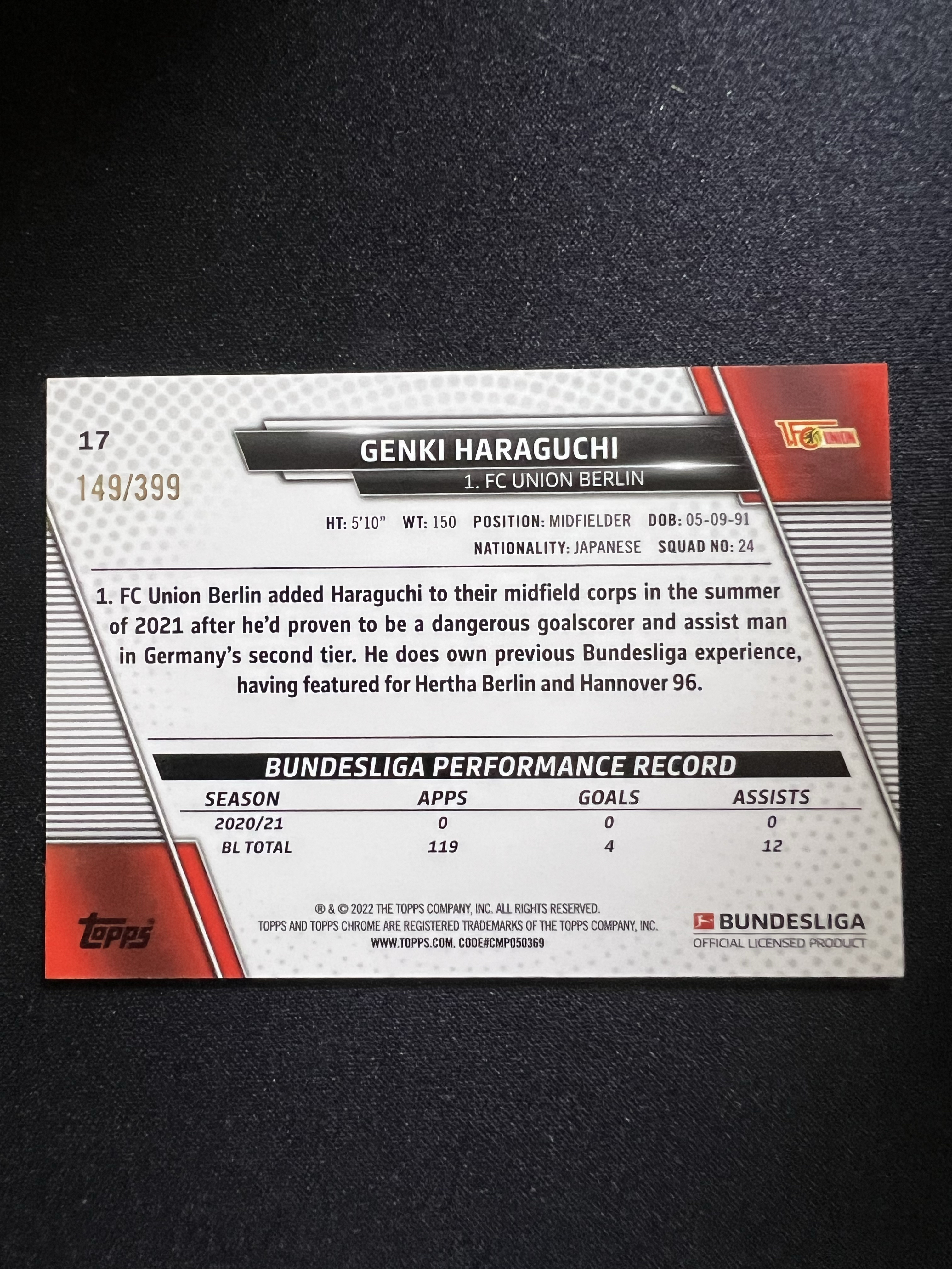 2021-22 Topps Chrome Genki Haraguchi 德甲Chrome 柏林联合 原口元气 399编 卡片精美 收藏必备 刺客-落枫