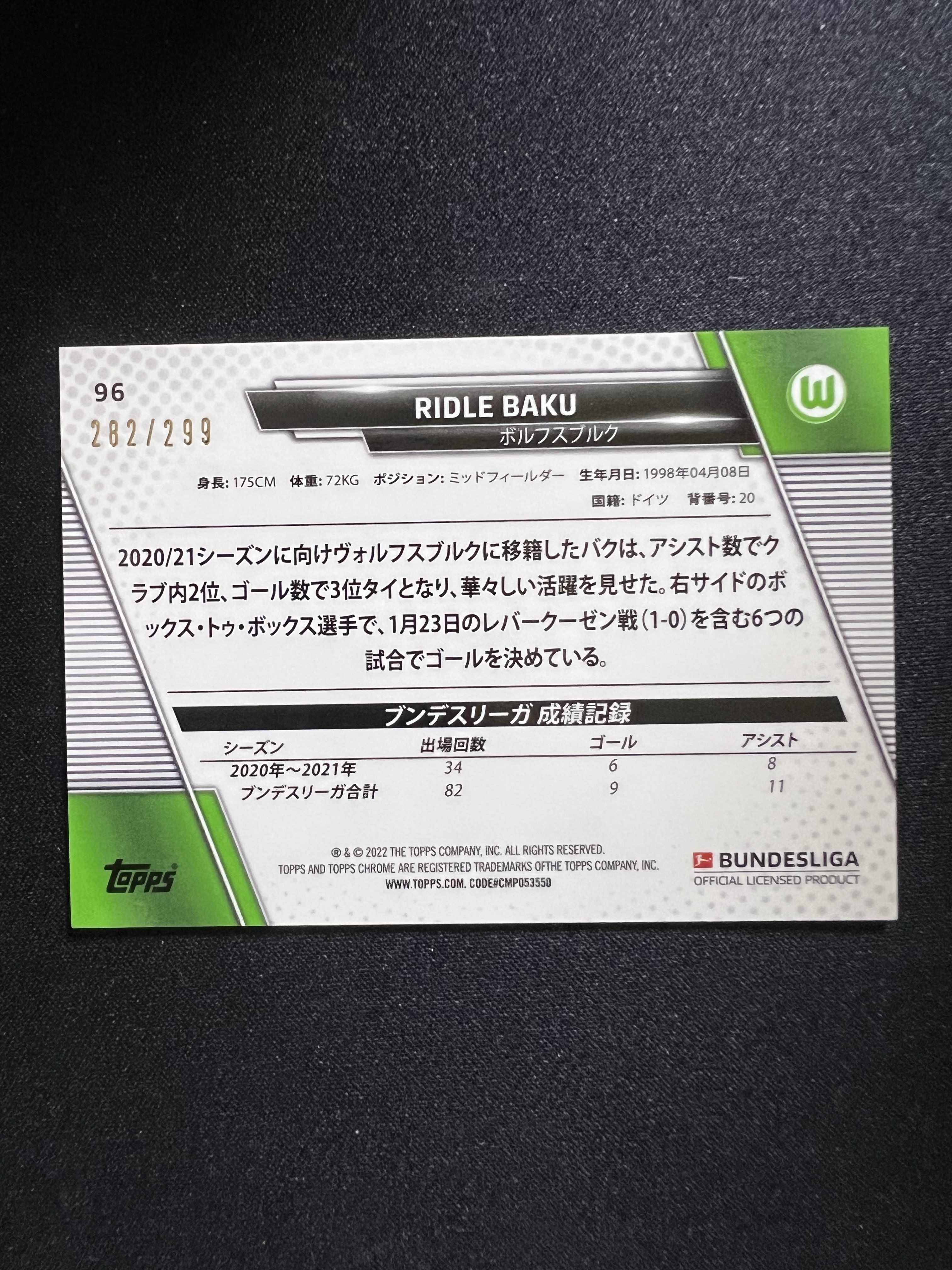 2021-22 Topps Chrome Ridle Baku 德甲Chrome 樱花 沃尔夫斯堡 巴库 299编 卡片精美 收藏必备 刺客-落枫