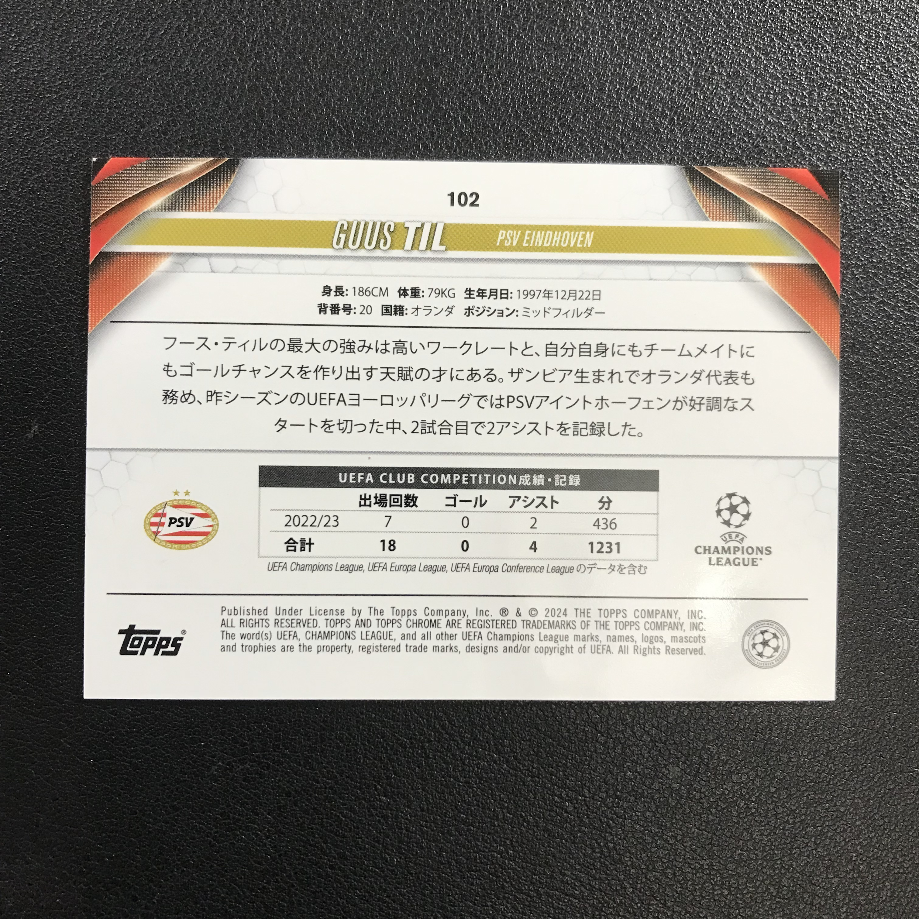 2023-24 Topps Chrome Guus Til 古斯 蒂尔 荷兰 埃因霍温 150 黄mojo折 UEFA 欧冠 日版 樱花 极光