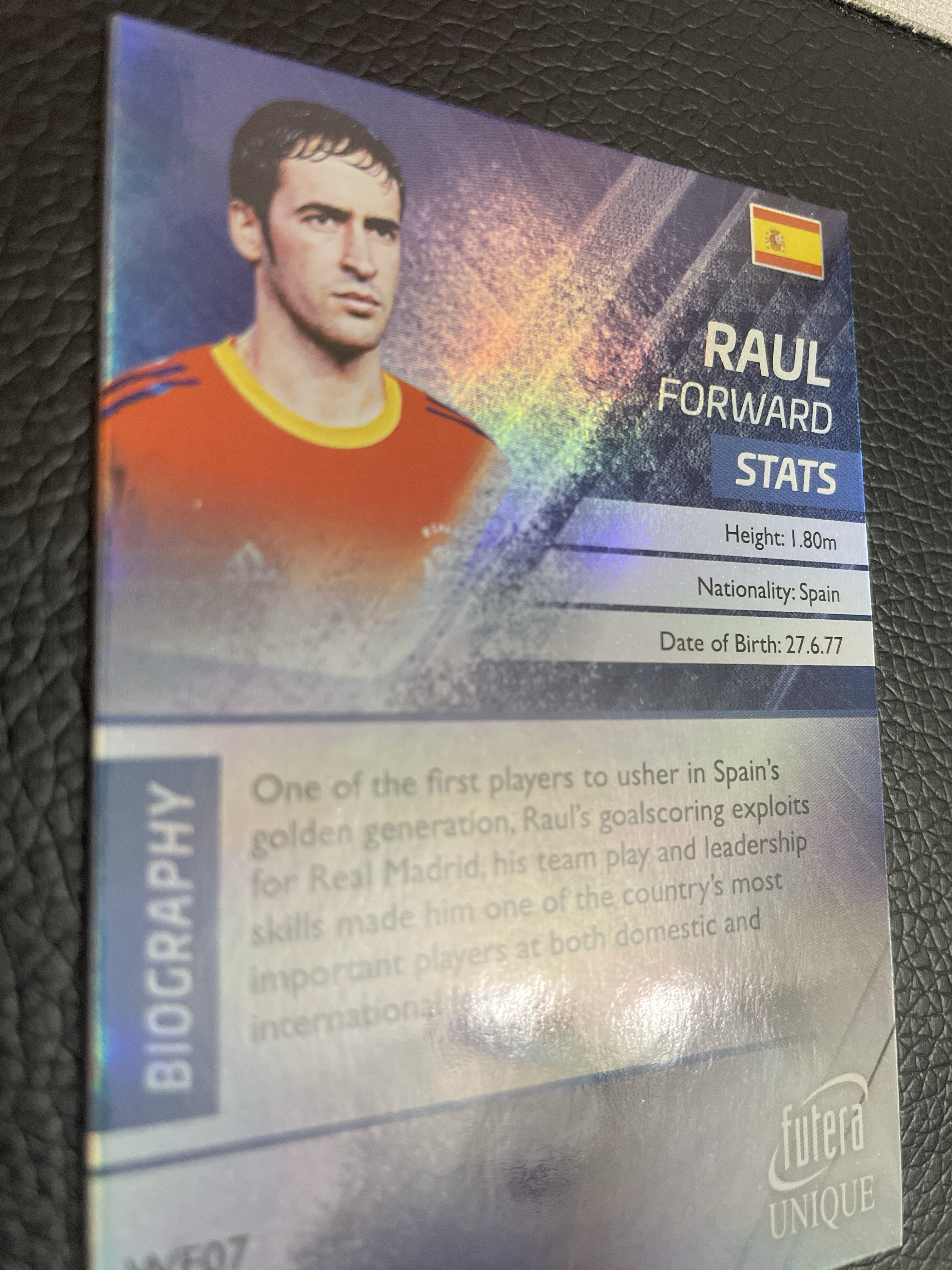 2018 futera unique福特拉 劳尔 西班牙国家队 皇马 西班牙斗牛士 皇马传奇7号 世界足球传奇 银卡 欧冠 卡品如图 老卡会有轻微镶嵌印痕 介意勿拍