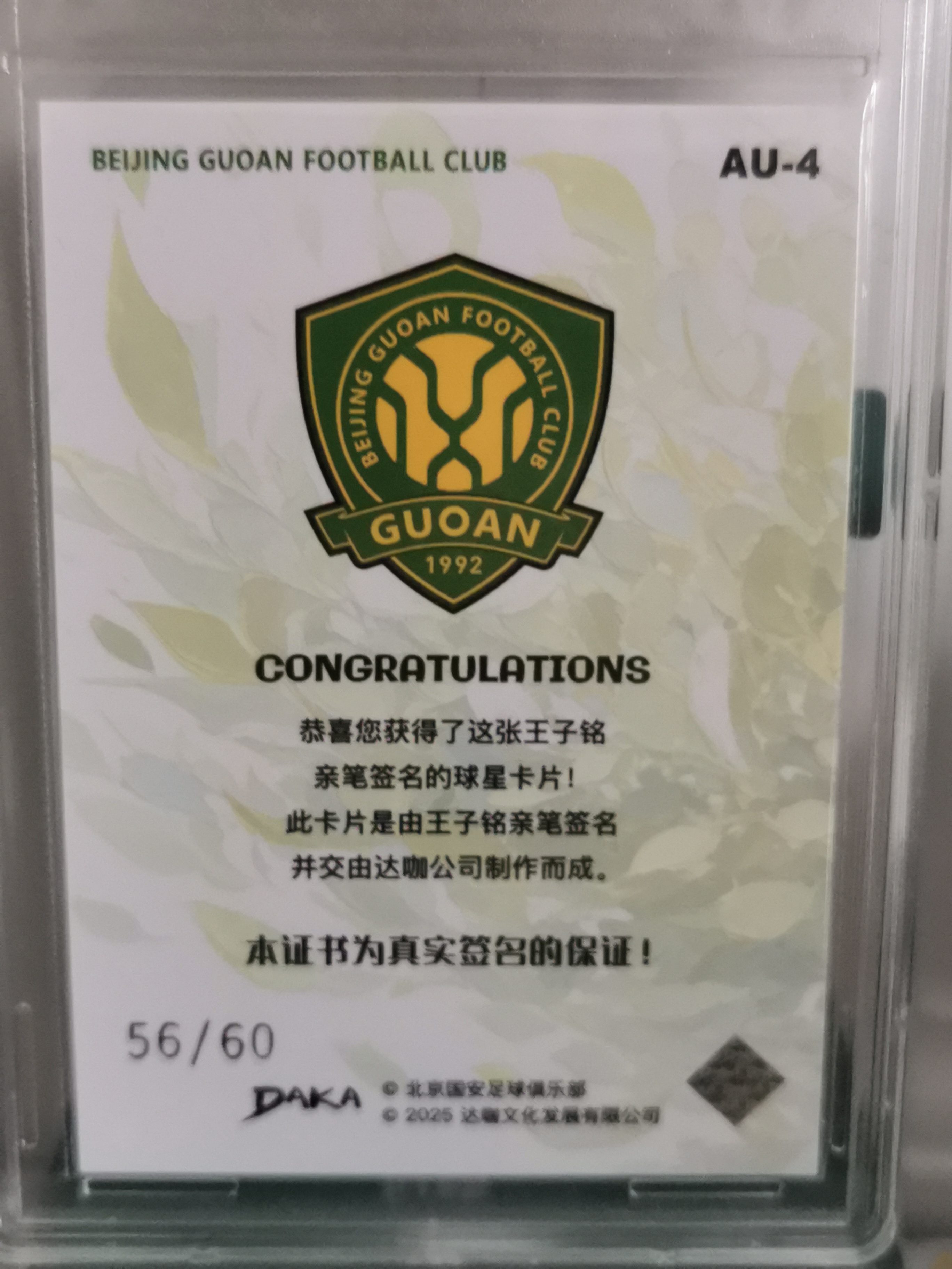2025 DAKA 北京中赫国安足球俱乐部 Wang Ziming 北京国安队盒 王子铭 签名卡 银折 56/60编 GBTC 评级 9/9.5分 实卡精美 收藏 凑套必备!