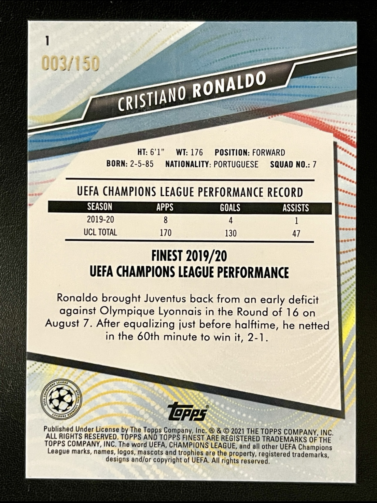 C罗 罗纳尔多 2021-22 Topps Finest 欧冠 003/150编 蓝折 折射漂亮 选图非常经典 曼联 皇马 尤文 欧洲杯冠军 欧国联冠军 值得收藏!