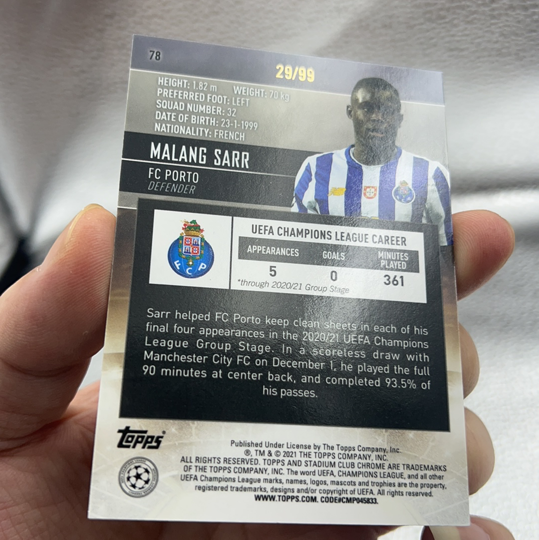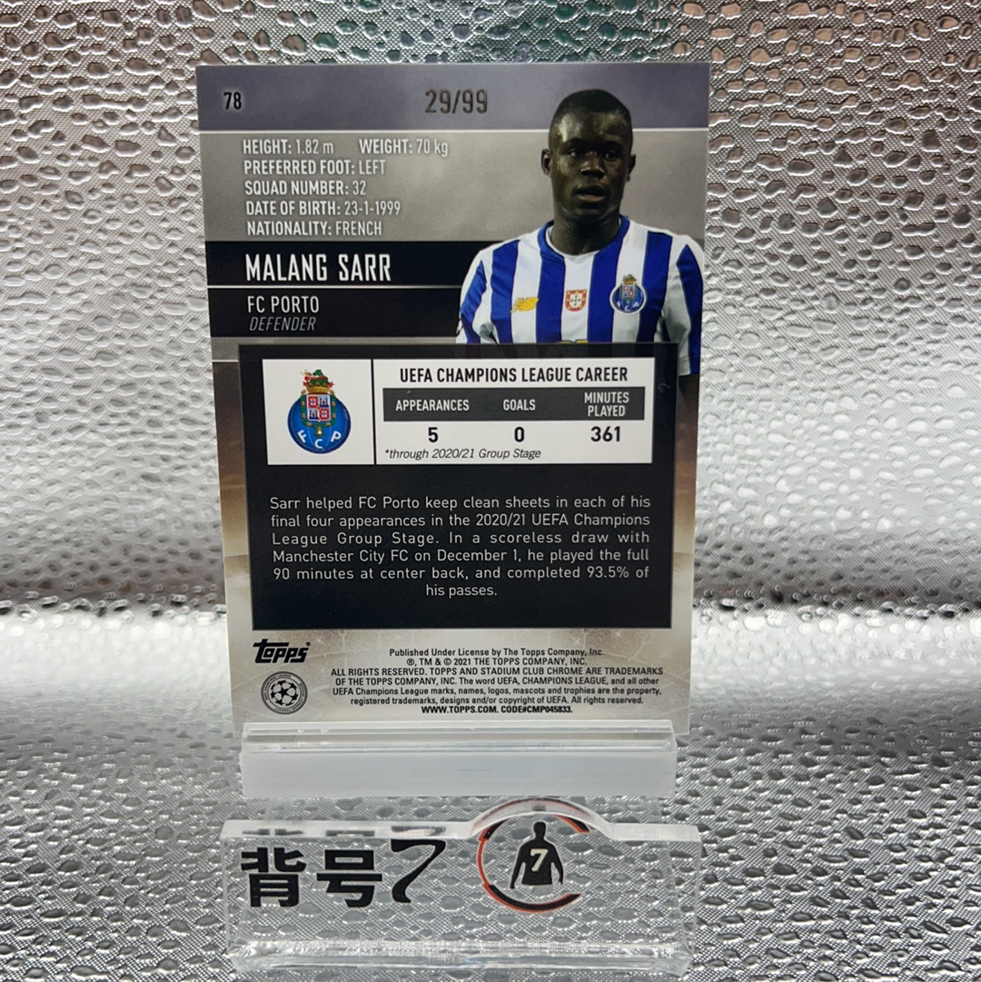 2021 Topps Stadium Club Chrome Malang Sarr RC 法国 波尔图 新秀RC 马朗 萨尔 竞技场 29/99编 正绿折 卡品如图 收藏必备-na