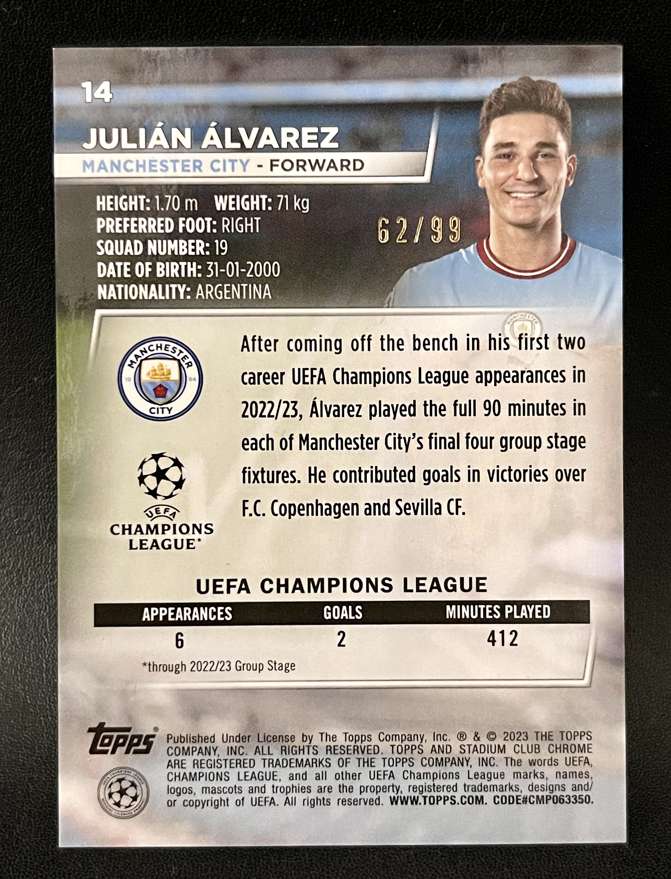 阿尔瓦雷斯 小蜘蛛 2023 Topps Chrome 欧冠竞技场 新秀RC 62/99编 绿折 折射非常漂亮 阿根廷 曼城 马竞 超新星 梅西接班人 本赛季表现大热 未来可期 值得收藏