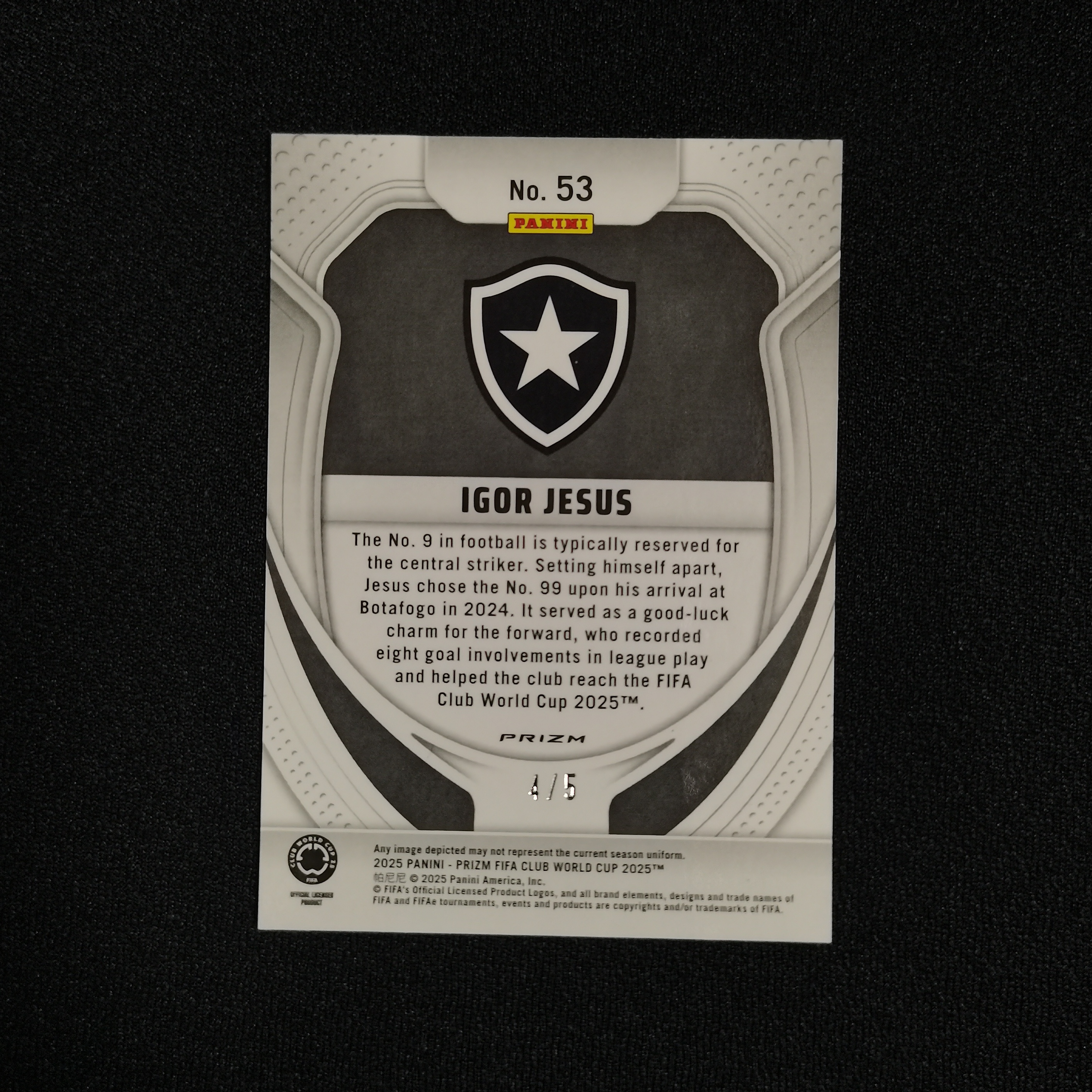 2025 Panini Prizm FIFA Club World Cup世俱杯 Igor Jesus 伊戈尔·热苏斯 博塔弗戈 RC新秀 5编 超低编 绿折  卡品如图