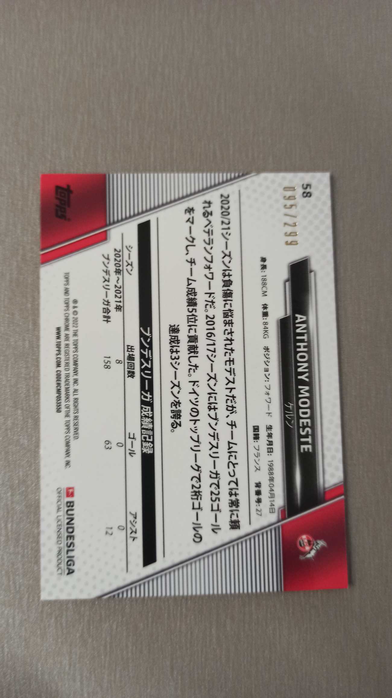 2022 Topps Chrome Bundesliga Japan Anthony Modeste 095/299编 莫德斯特 卡品如图 收藏必备 卡默认都有瑕疵白边 介意勿拍