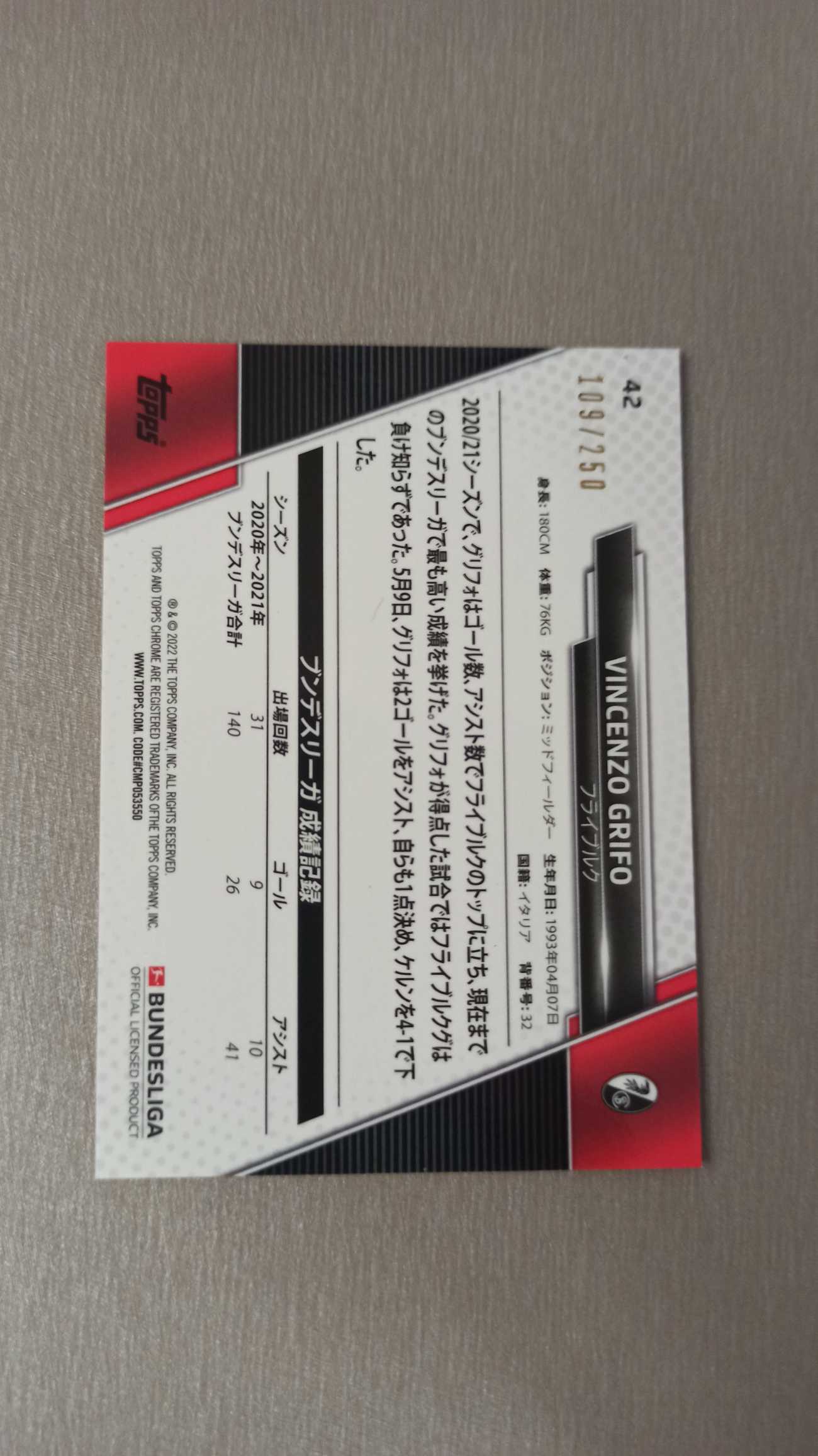 2022 Topps Chrome Bundesliga Japan Vincenzo Grifo 109/250编 格里弗 卡品如图 收藏必备 卡默认都有瑕疵白边 介意勿拍