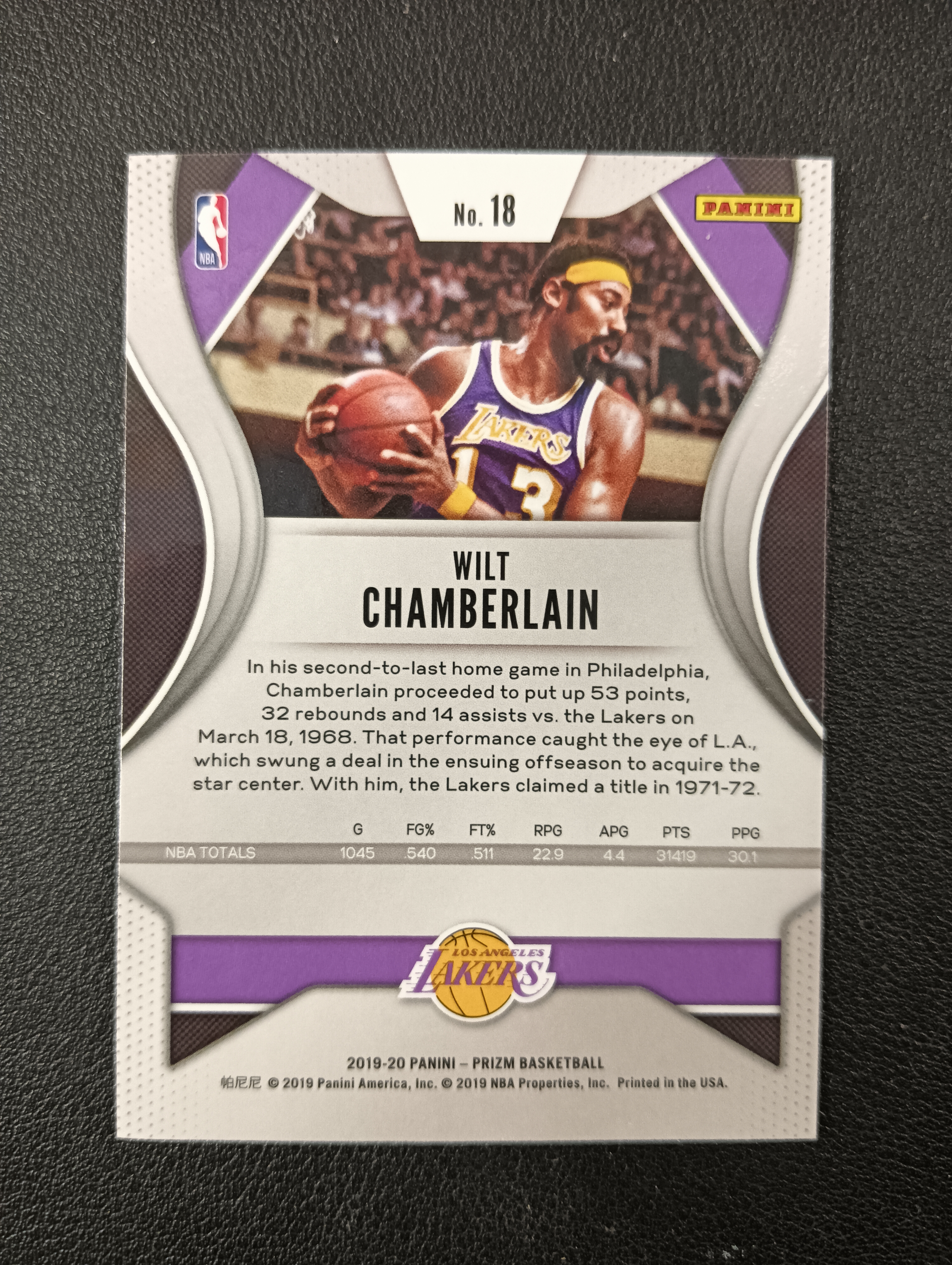 2019-20 PANINI PRIZM WILT CHAMBERLAIN 【卡仓-晋语073】湖人 威尔特张伯伦 篮球皇帝 BASE NO.18