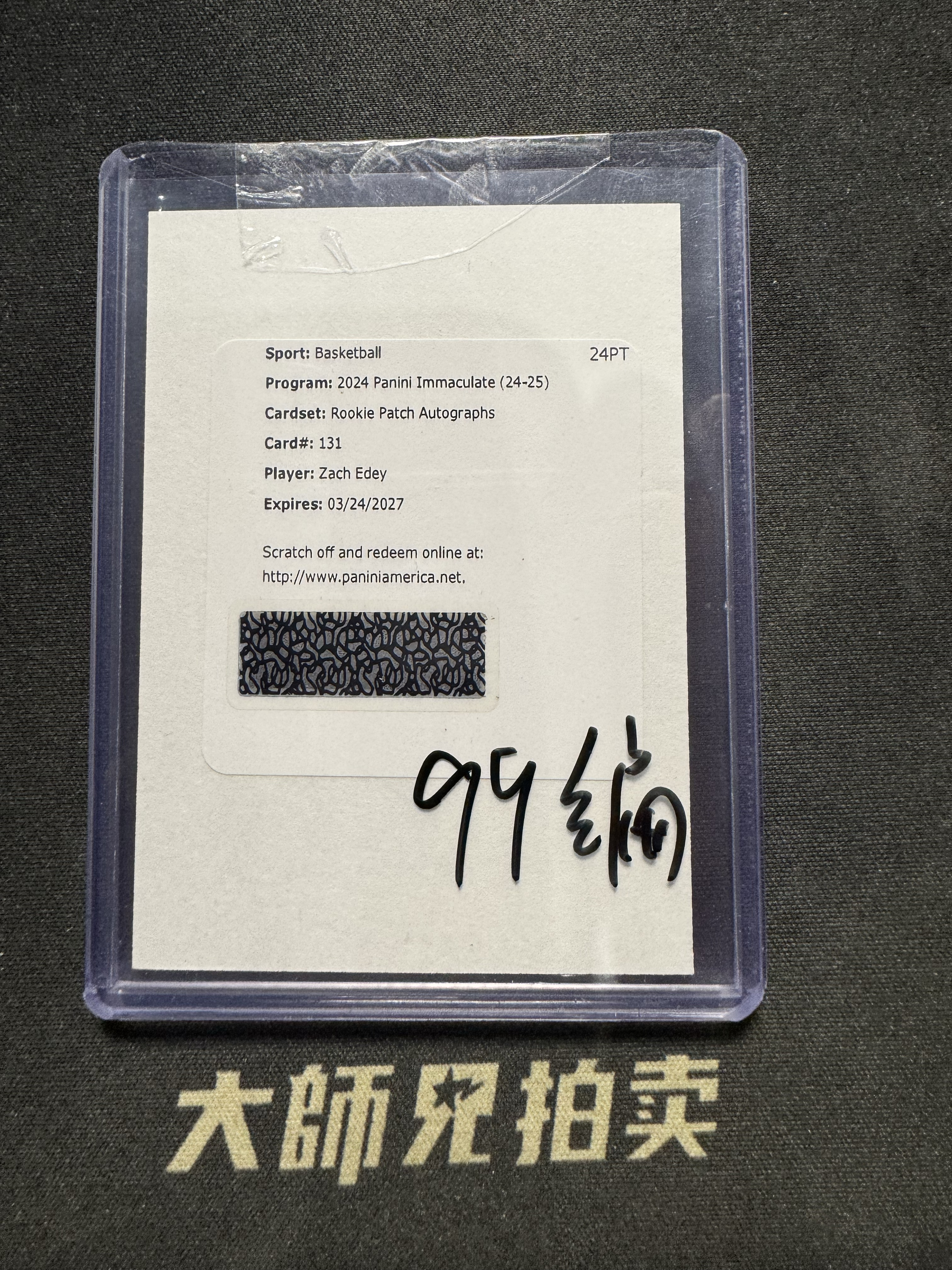 【大师兄拍卖】2024-25 Panini immaculate Zach Edey RC 灰熊 扎克 伊迪 新秀 /99编 rpa 签字 卡签 球衣物料patch 交换版交换板不发码 -赵环宇-