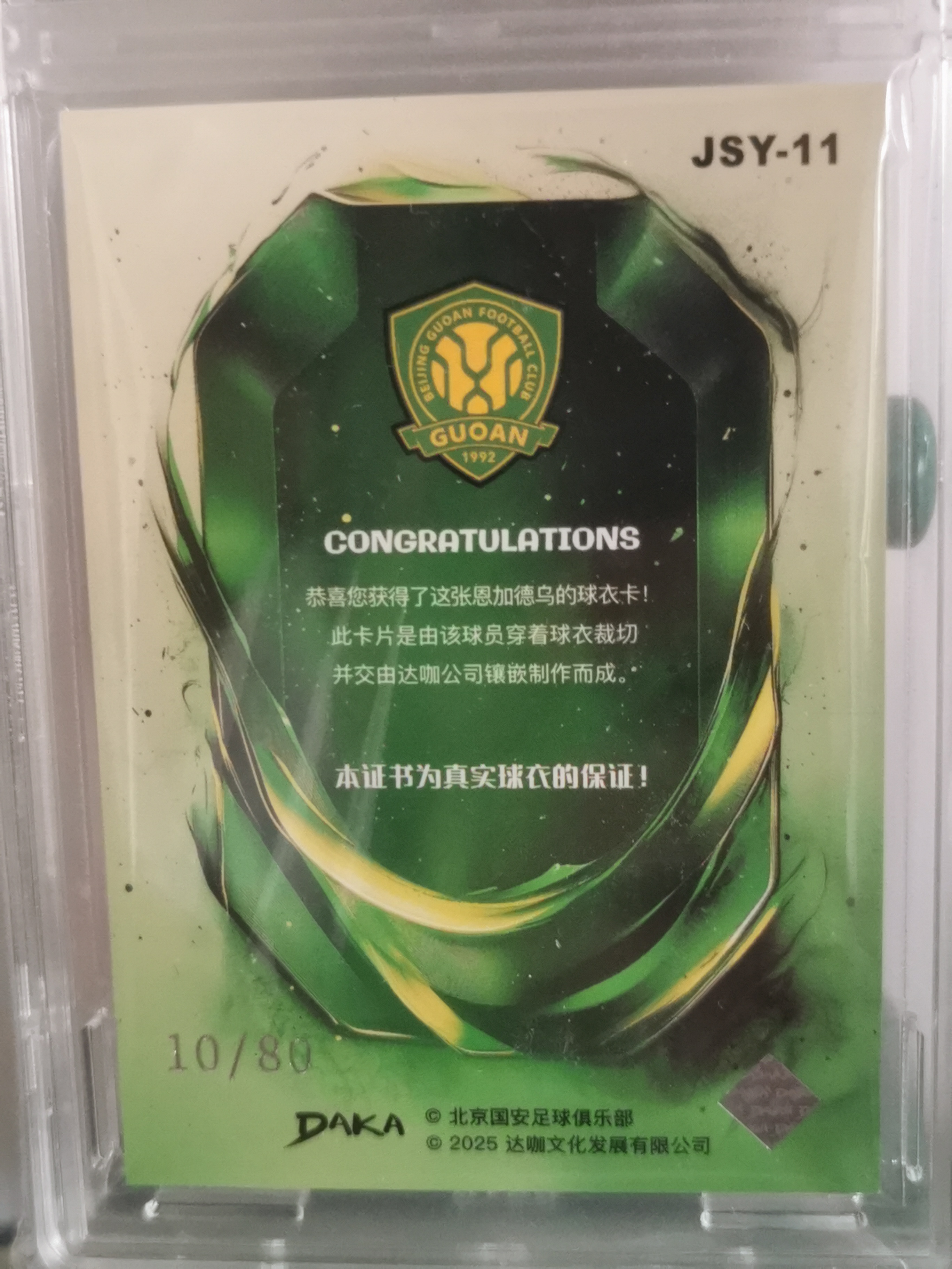 2025 DAKA 北京中赫国安足球俱乐部 恩加德乌 北京国安队盒 恩加德乌 单窗球衣卡 银折 10/80编 GBTC 评级10分 稀有 实卡精美 收藏 凑套必备!