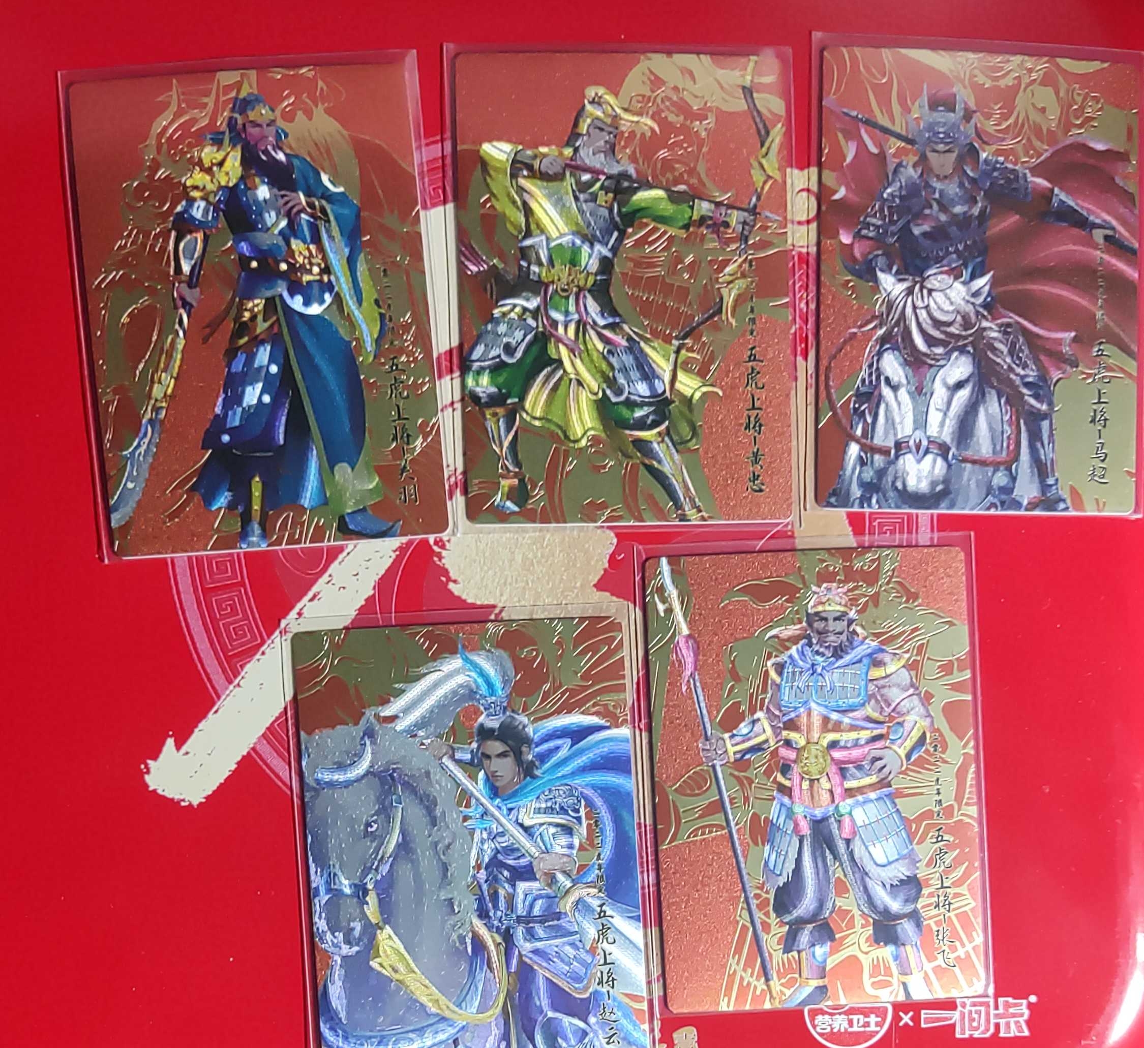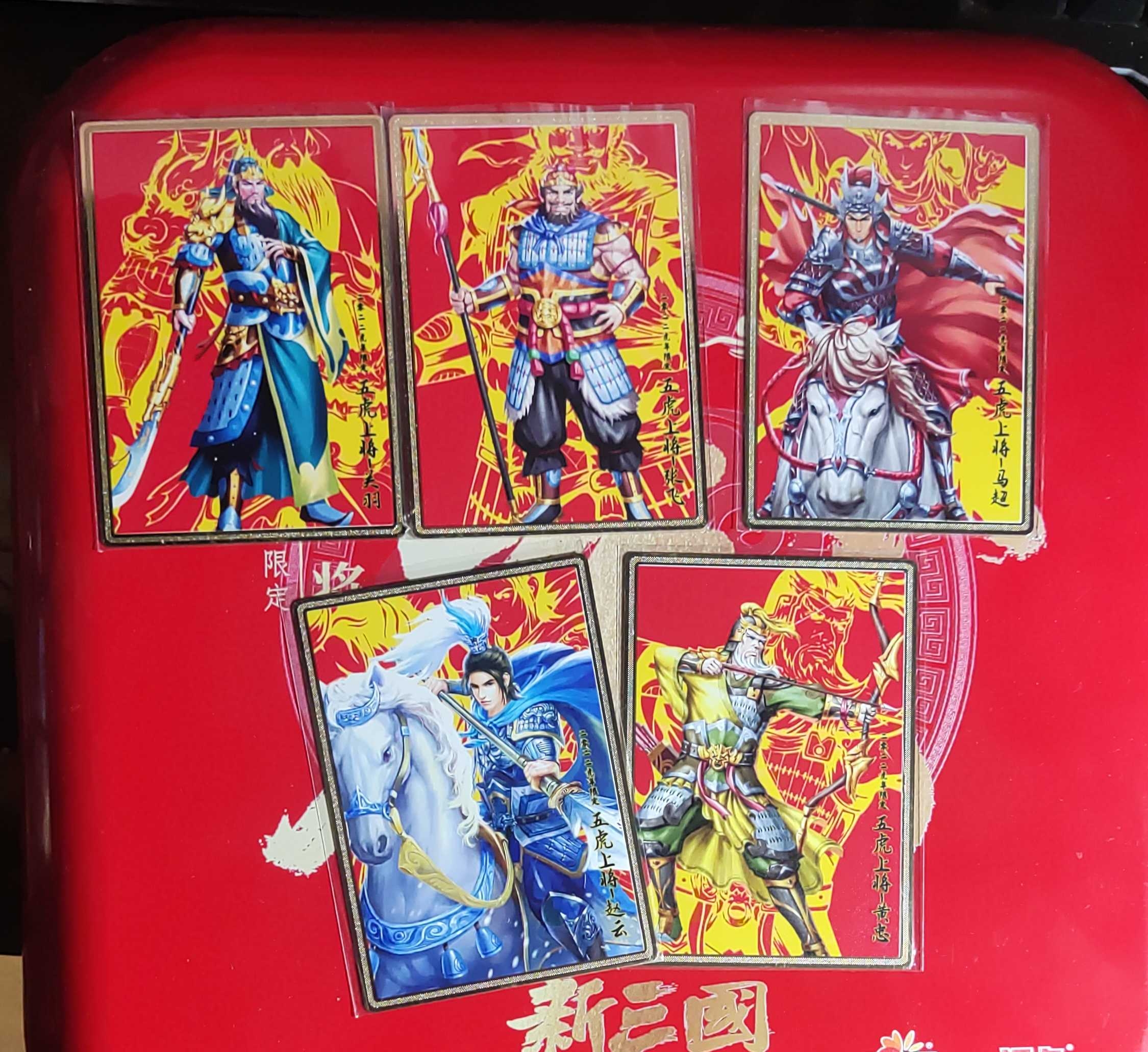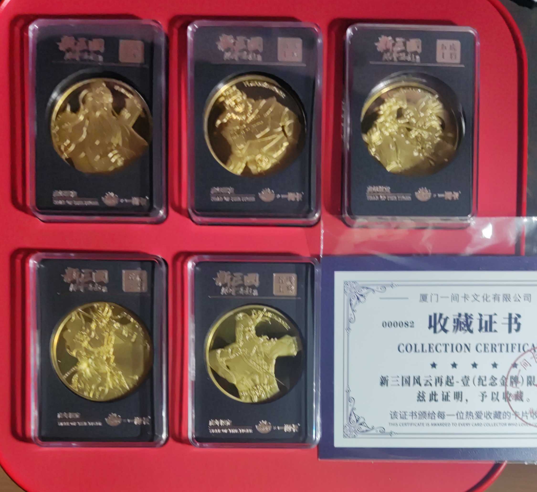 一间卡新三国风云再起五虎上将纪念章5枚金属卡粗闪卡各五张证书编号82外包装有伤见图
