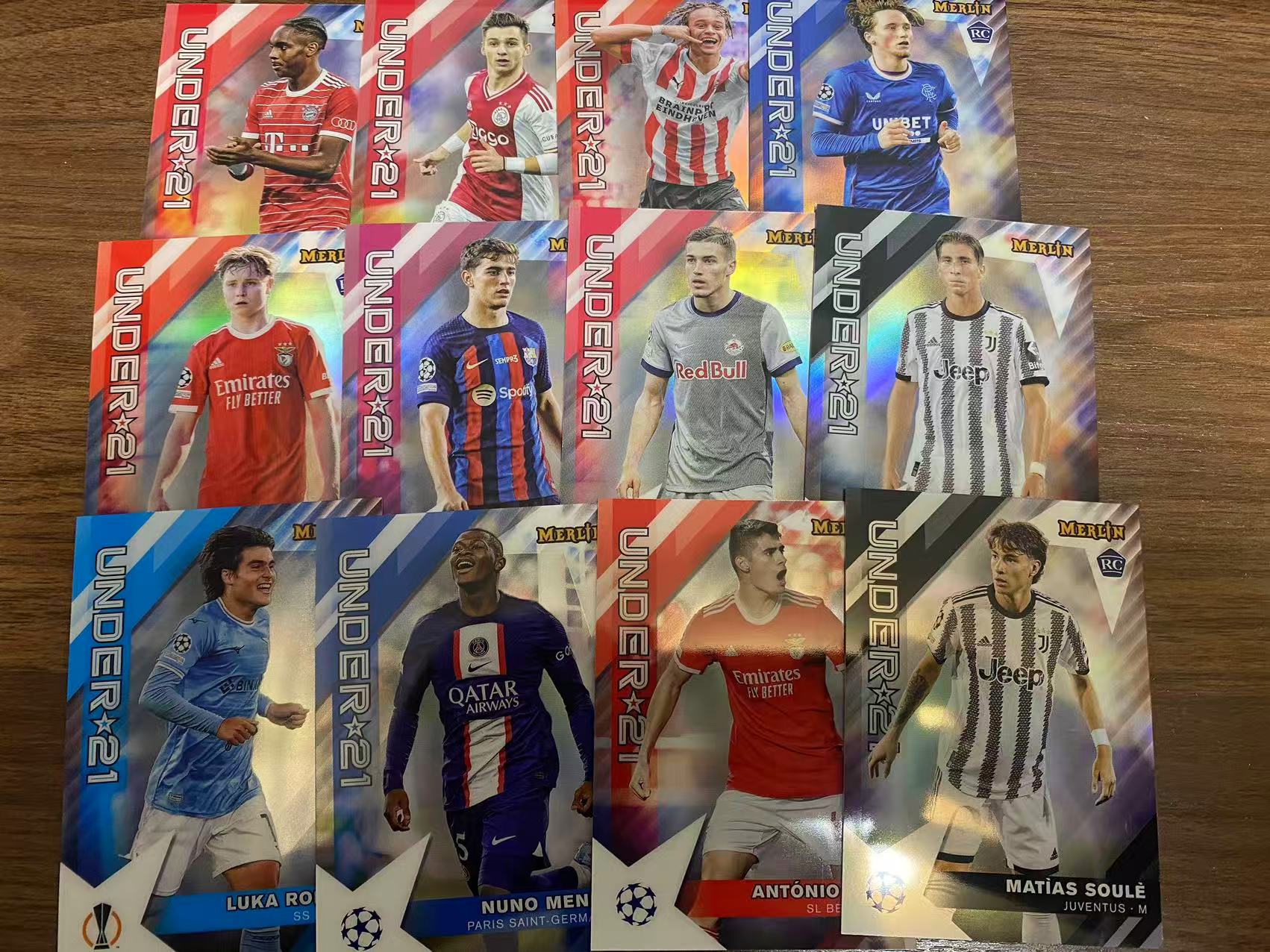 2022-23 Topps Merlin chrome U21 stars 梅林 欧战 新星特卡 12张lot 安东尼奥·席尔瓦 孔塞桑 西蒙斯 谢尔德鲁普 加维 苏西奇 门德斯 米雷蒂 特尔 等