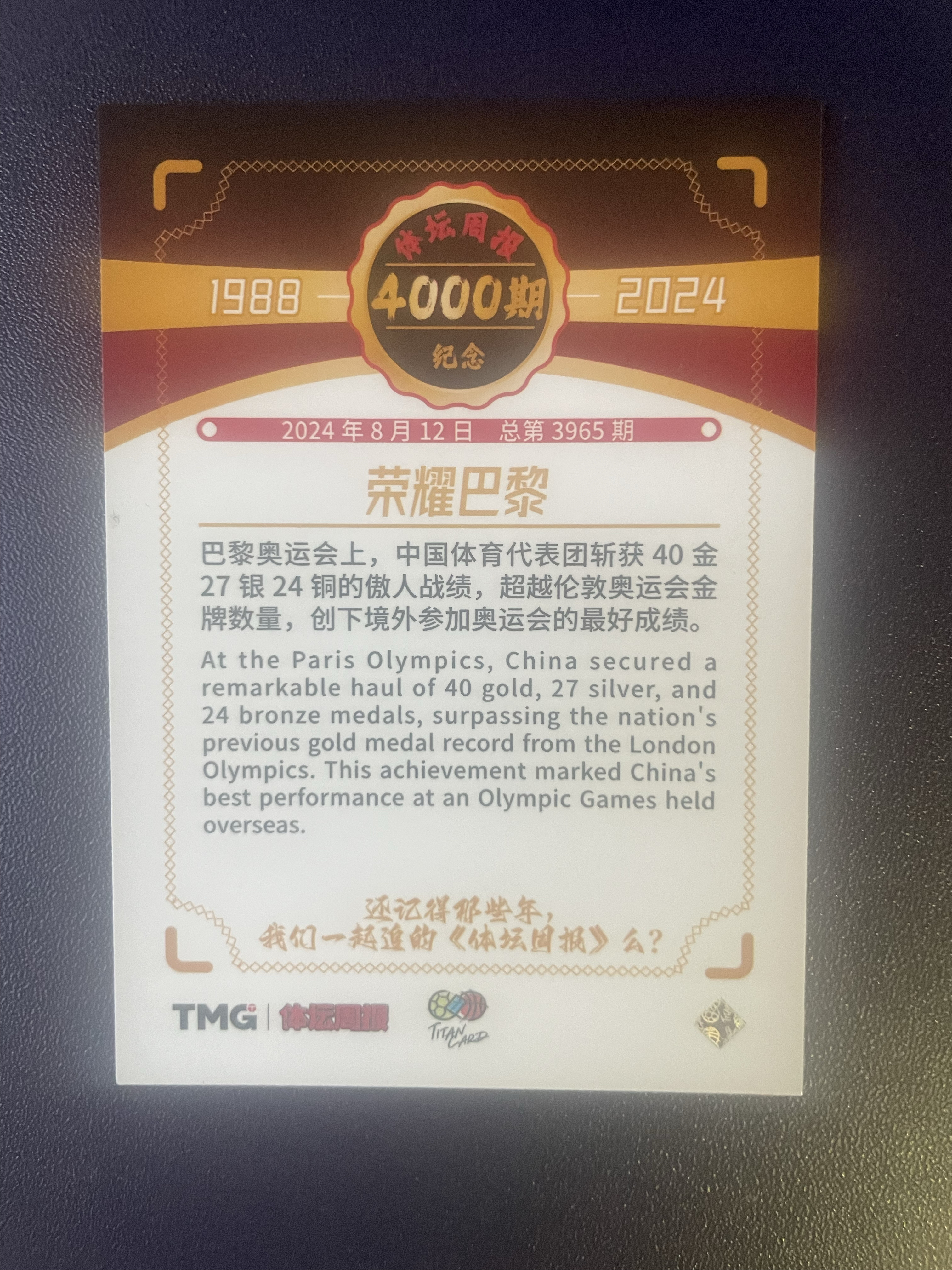 2024-25 TMG 体坛周报 China 荣耀巴黎 巴黎奥运会 创纪录 纪念意义非凡 细节如图不保卡品 玖玖