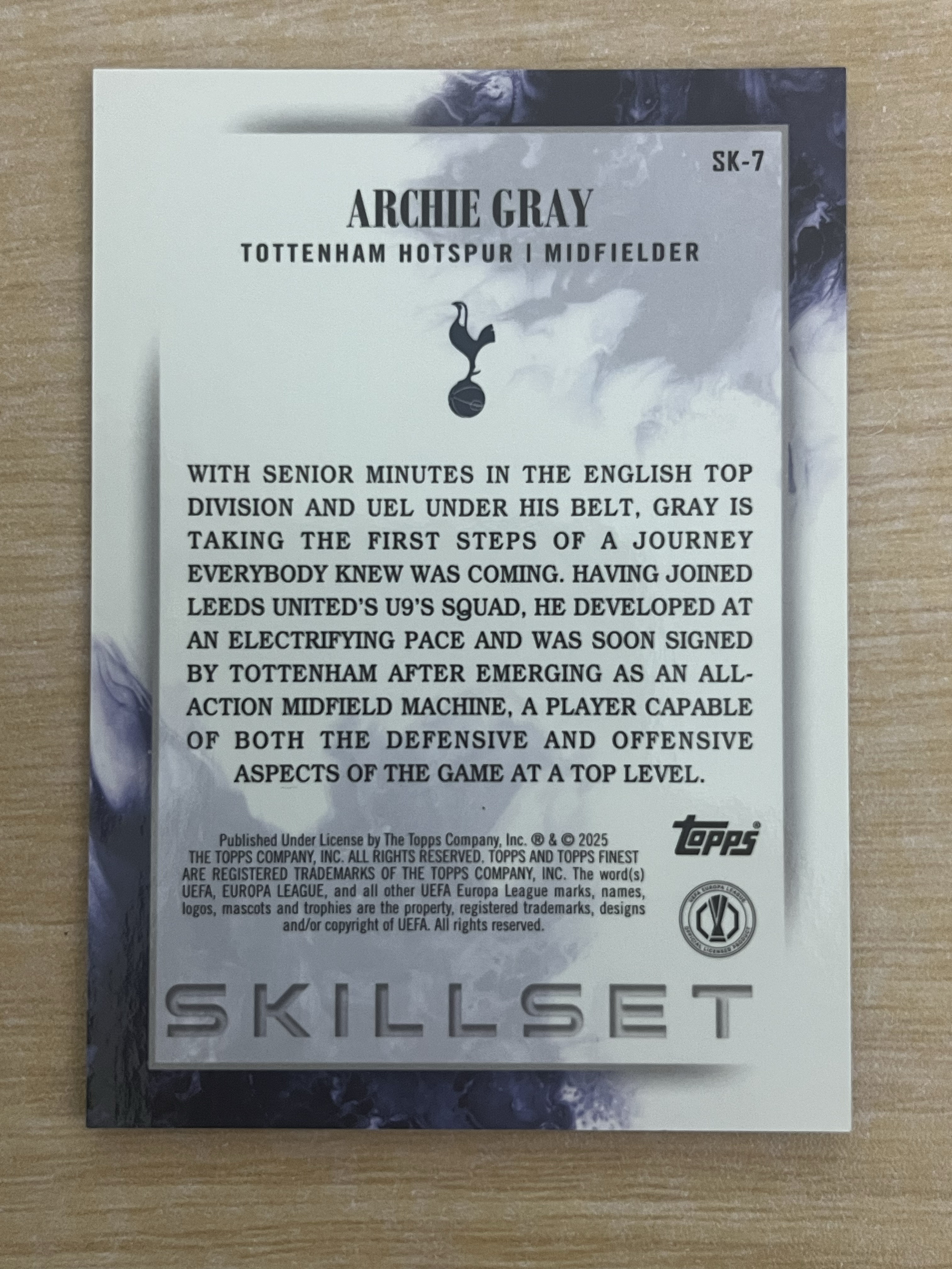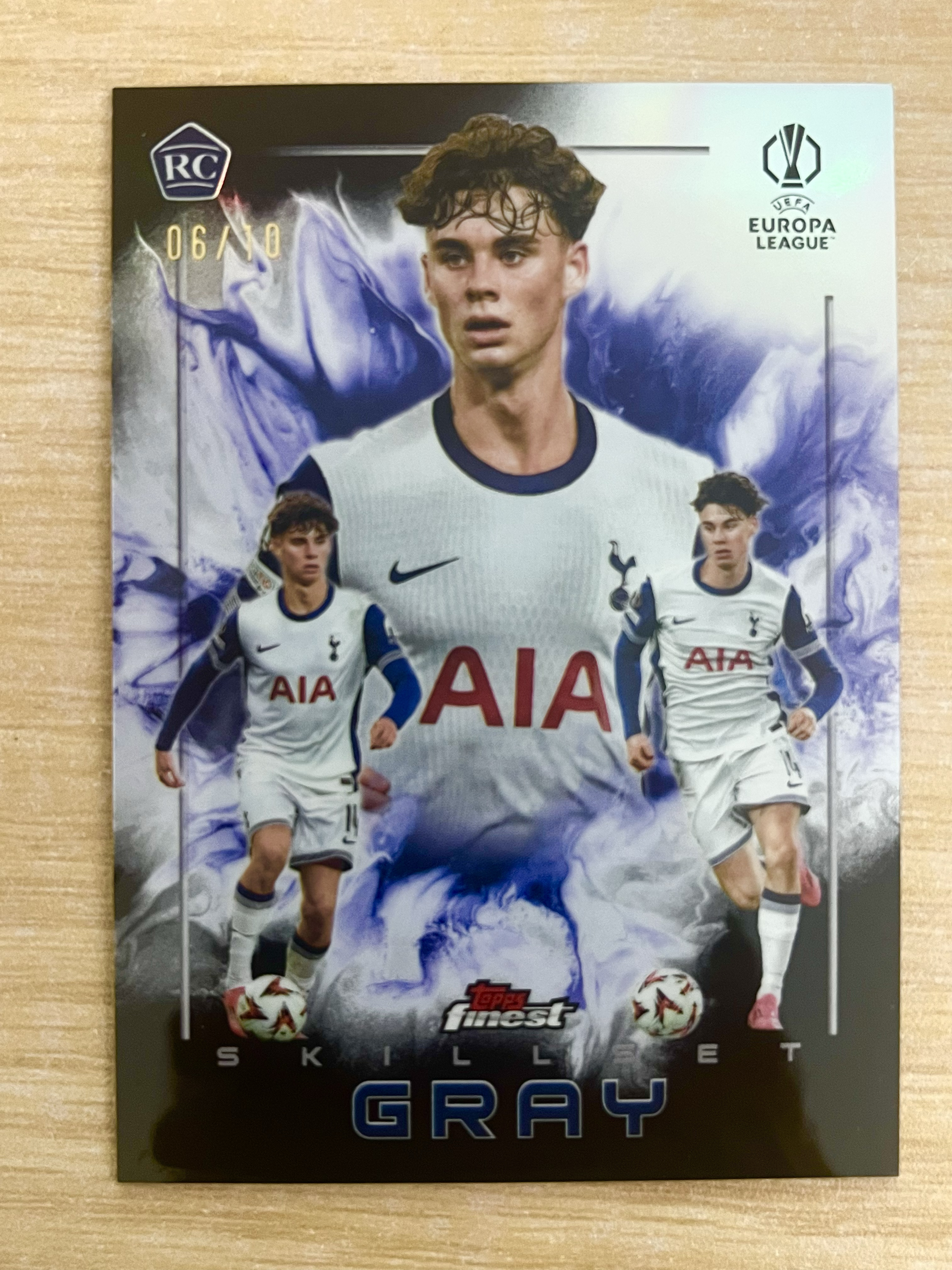 2025 Topps Finest Archie Gray RC 欧冠Finest系列 阿奇-格雷 06/10编 黑折 三头 技巧特卡 RC新秀 英格兰 热刺 未来之星