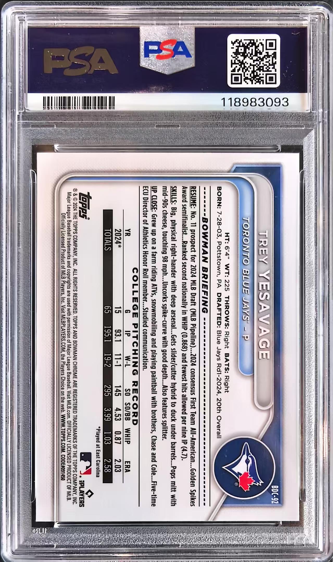 2024 Bowman Chrome 新秀 表现炸裂 Trey Yesavage 250编折射 psa 9分 蓝鸟 未来巨星  已上大联盟  收藏凑套必备 实卡精美 卡品如图 出价既认可当前价格