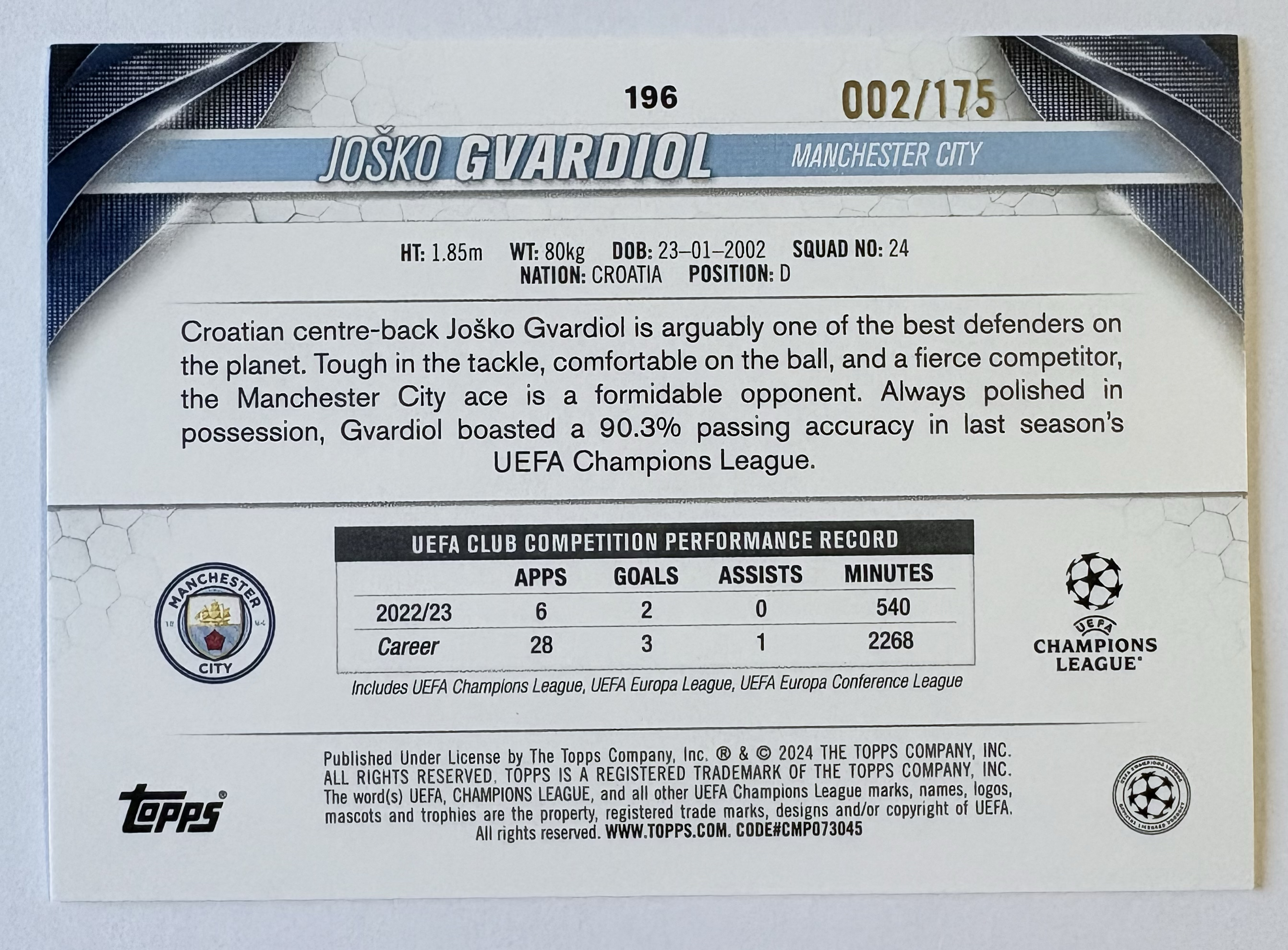 2023-24 Topps UCC GUARDIOL Josko 格瓦迪奥尔 曼城 克罗地亚 莱比锡红牛 锋卫 欧冠 碧玉 175编 蓝玉折 折射 人迷队迷专收