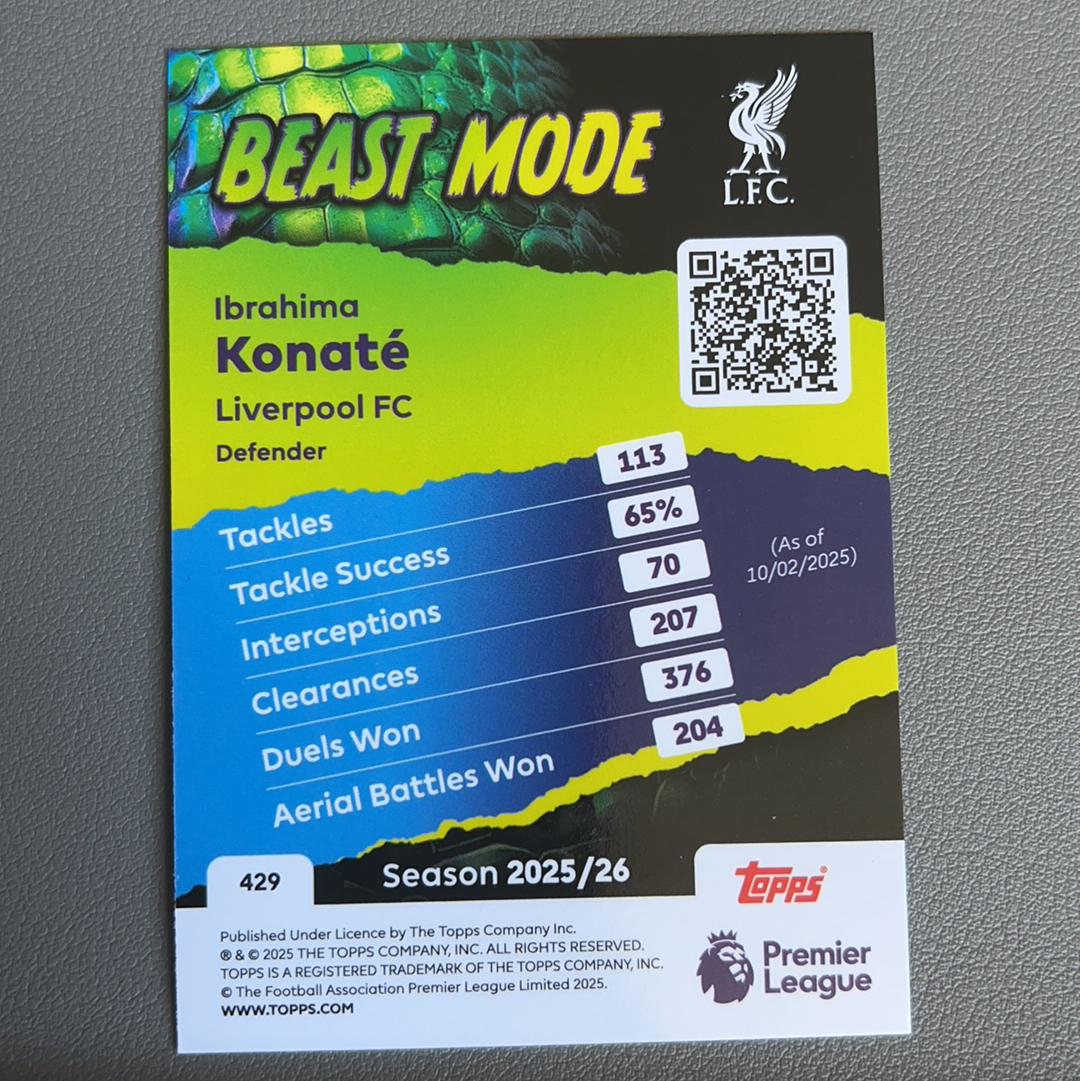 2025-26 Topps Premier League Ibrahima Konate 科纳特 利物浦 法国 Beast Mode 野兽模式特卡 钻石折射 英超 轻印如图