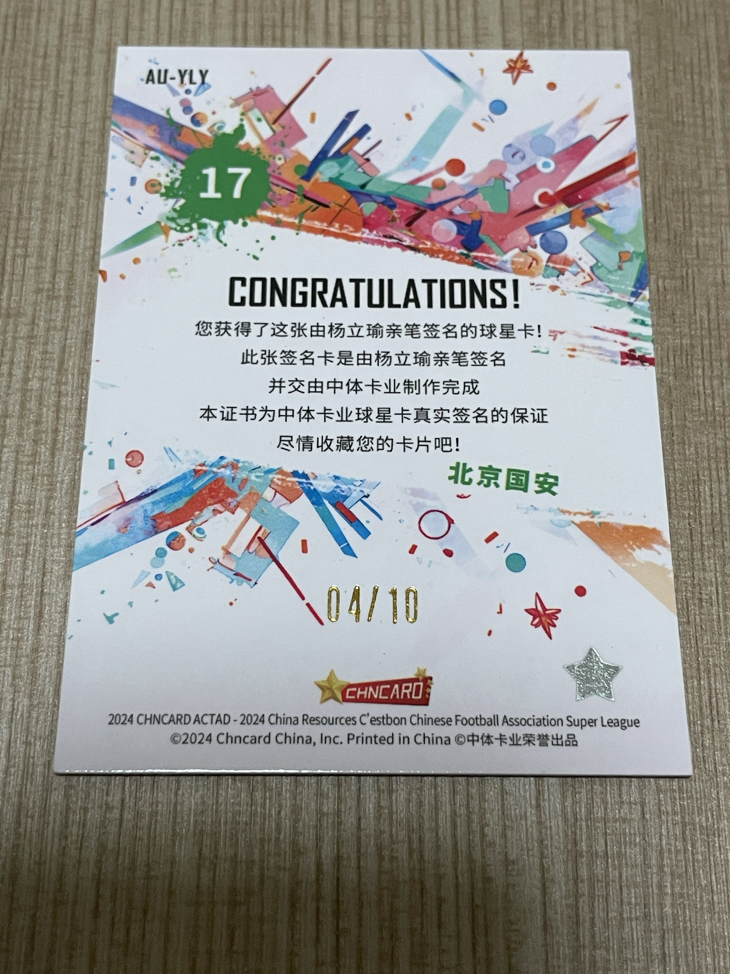 2024 中体卡业 CSL ACTAD(渲染) 北京国安 杨立瑜 /10编 签字 金折 金波纹 超低编 箱hit 国足 中国体育 签字完美 广州恒大 天津 足协杯冠军有升值空间 中超