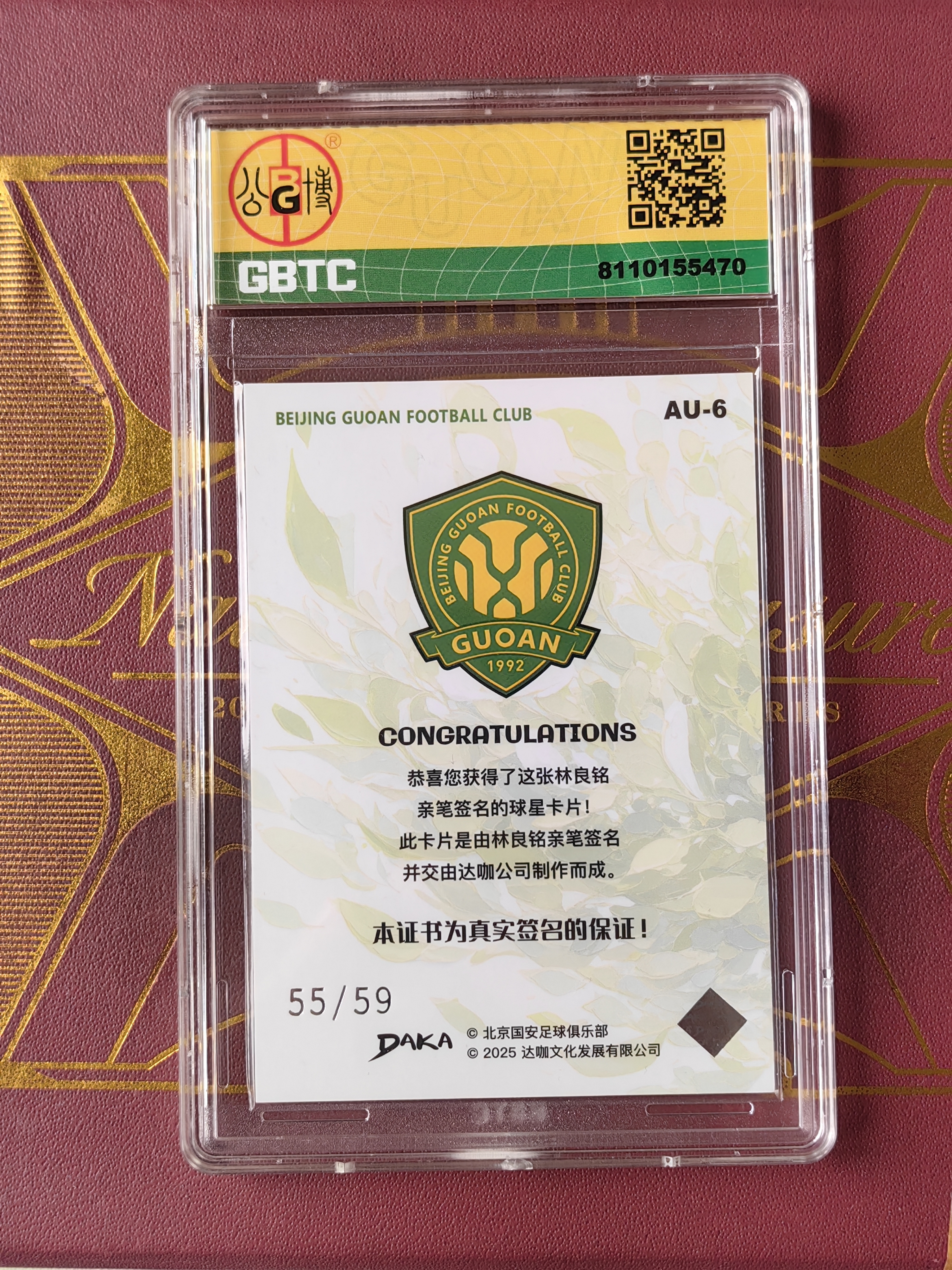 2025 DAKA 北京国安足球俱乐部 Lin Liangming 卡卡星球拍卖 达咖文化 北京国安队盒 林良铭 签字 卡签 55/59编 银折 公博评级10/9分