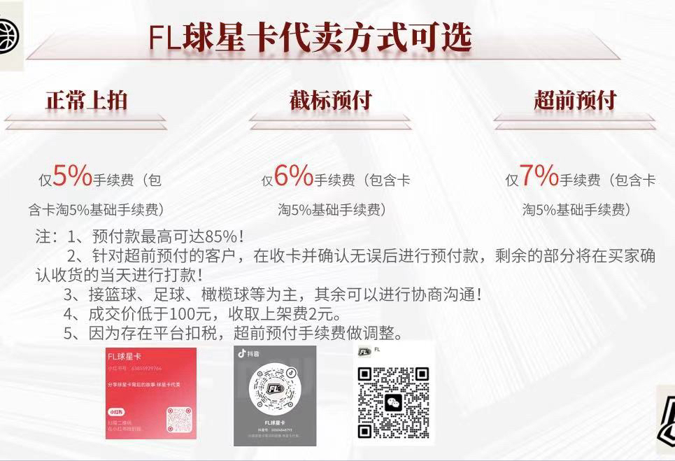 FL卡淘代卖: 参与竞拍的卡迷朋友请注意以下几点事项⚠️拍卖细则: 【注:请仔细阅读以下条款,出价视为默认接受以下规则】 1.发货默认顺丰寄付,详情运费有介绍。买家需在截标后3日内按时付款,付款后的3天内将根据付款顺序依次进行发货,由于发货量大,请勿频繁催促发货。高价值卡片建议保价运输,如未保价出现快递发出后因快递公司原因发生丢失/损毁的情况,本店只帮忙联系,不负责赔付。 2.【卡品】卡片品相如图。如无图片特殊展示瑕疵均为通行品相。因目前panini和topps卡品下降明显,普遍都存在印刷线,故今日起不再特别标注印刷线为瑕疵品,有明显瑕疵会做说明。一般prizm、optic 等系列薄卡的小划痕印刷线,国宝、IMM等系列厚卡的小白边、小白角、翘角、钝角等,都属于通行品相,卡砖上的划痕和破损不属于品相问题。完美主义者请直接购买评级卡,发货之后不退不换,二手商品不适用七天无理由退货规则! 3.当天有拍下多张卡片/盒子的客户会在当日所有拍卖截标后30分钟内,统一进行订单合并。【承接代卖】本号商品均为代卖,以篮球、足球和宝可梦为主。 本店所有商品均为委托代理售卖。由于代卖工作量多且繁琐, 【站内私信会不定时上线统一回复】,烦请耐心等待。感谢您的理解与支持!