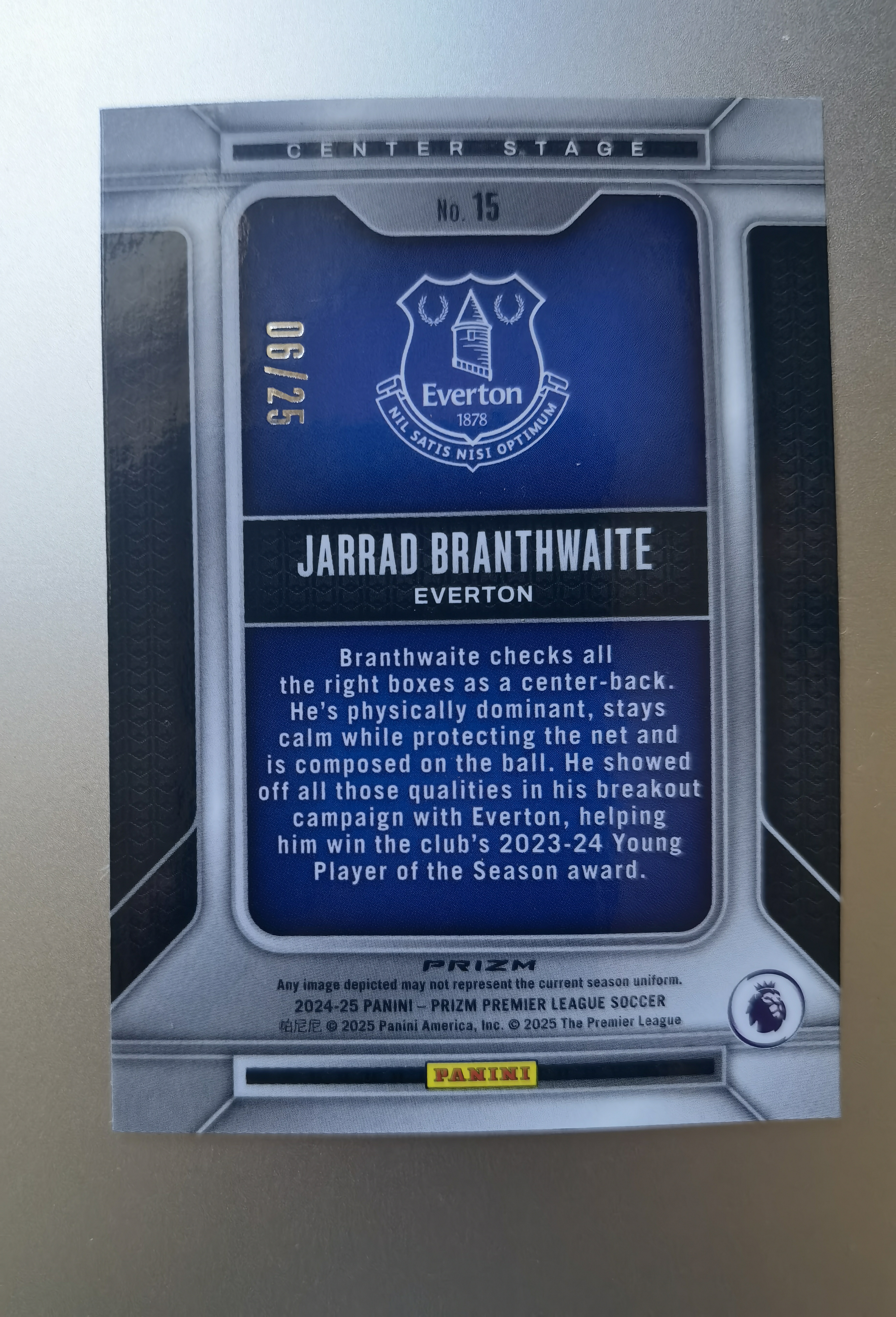 2024-25 Panini Prizm Jarrad Branthwaite 英超pz 布兰斯韦特 25编 橙折 中央舞台特卡 埃弗顿 英格兰