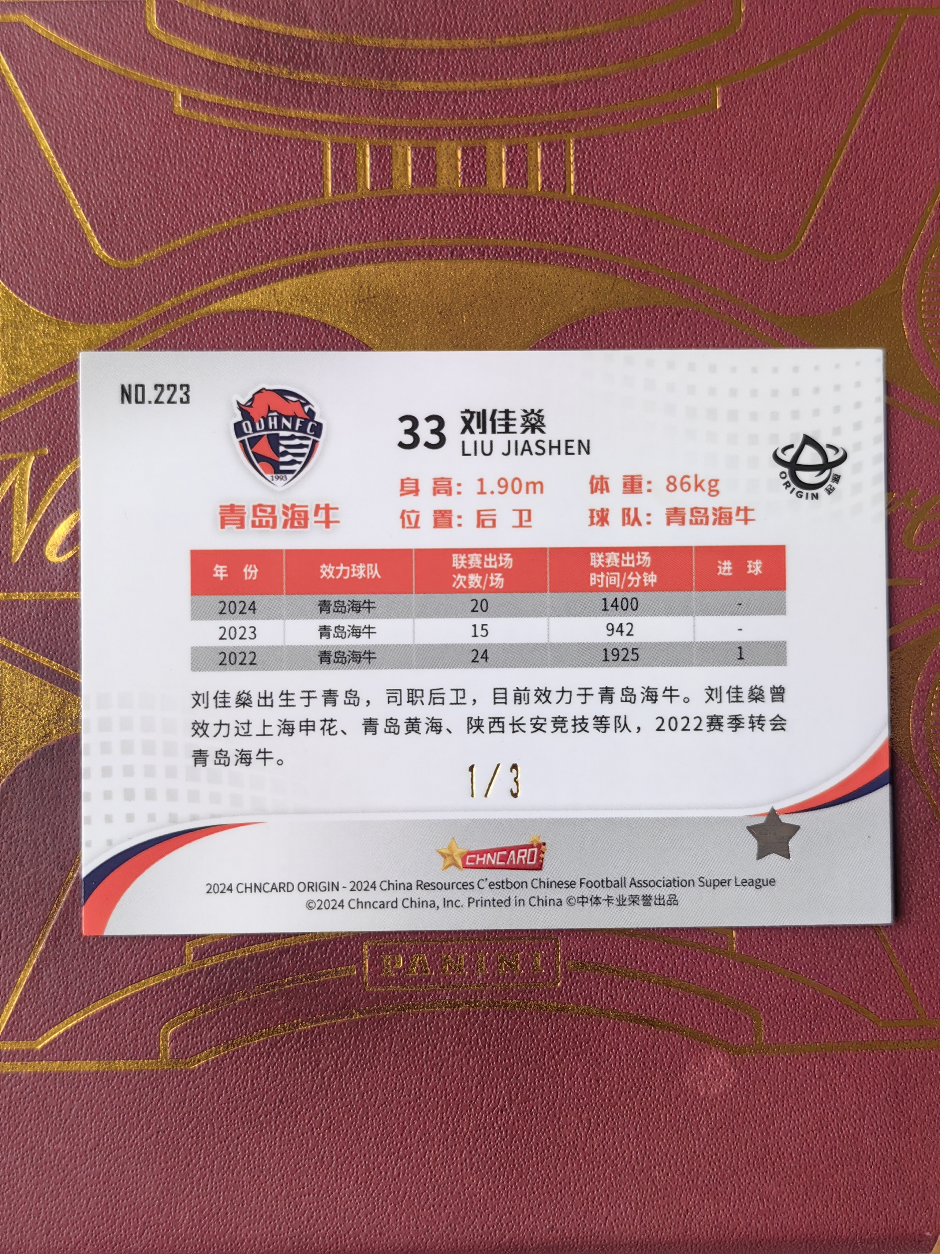 2024 中体卡业 Origin Liu Jiashen 卡卡星球拍卖 中体卡业 CSL 起源 中超联赛 青岛海牛 刘佳燊 1/3编 首编1/1 超低编 爆绿折 折射