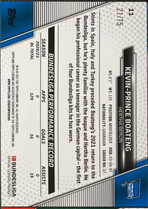 2022 Topps Chrome Emmanuel Boateng 凯文 博阿滕 拜仁 柏林赫塔 德国 德甲 波纹折射 21/75编