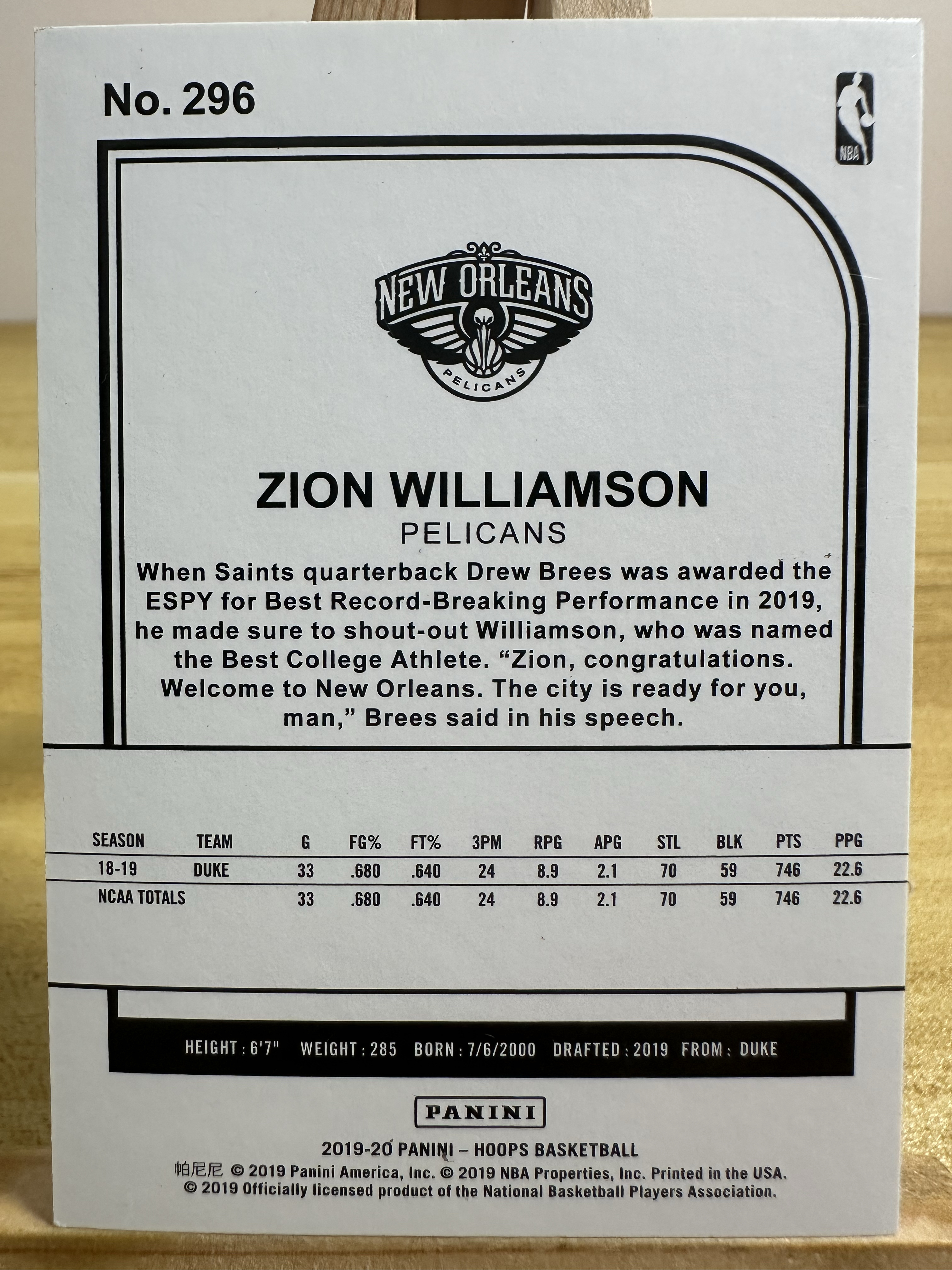 2019-20 Panini NBA Hoops Zion Williamson RC 新秀 鹈鹕 锡安 威廉姆斯 base 胖虎 c599