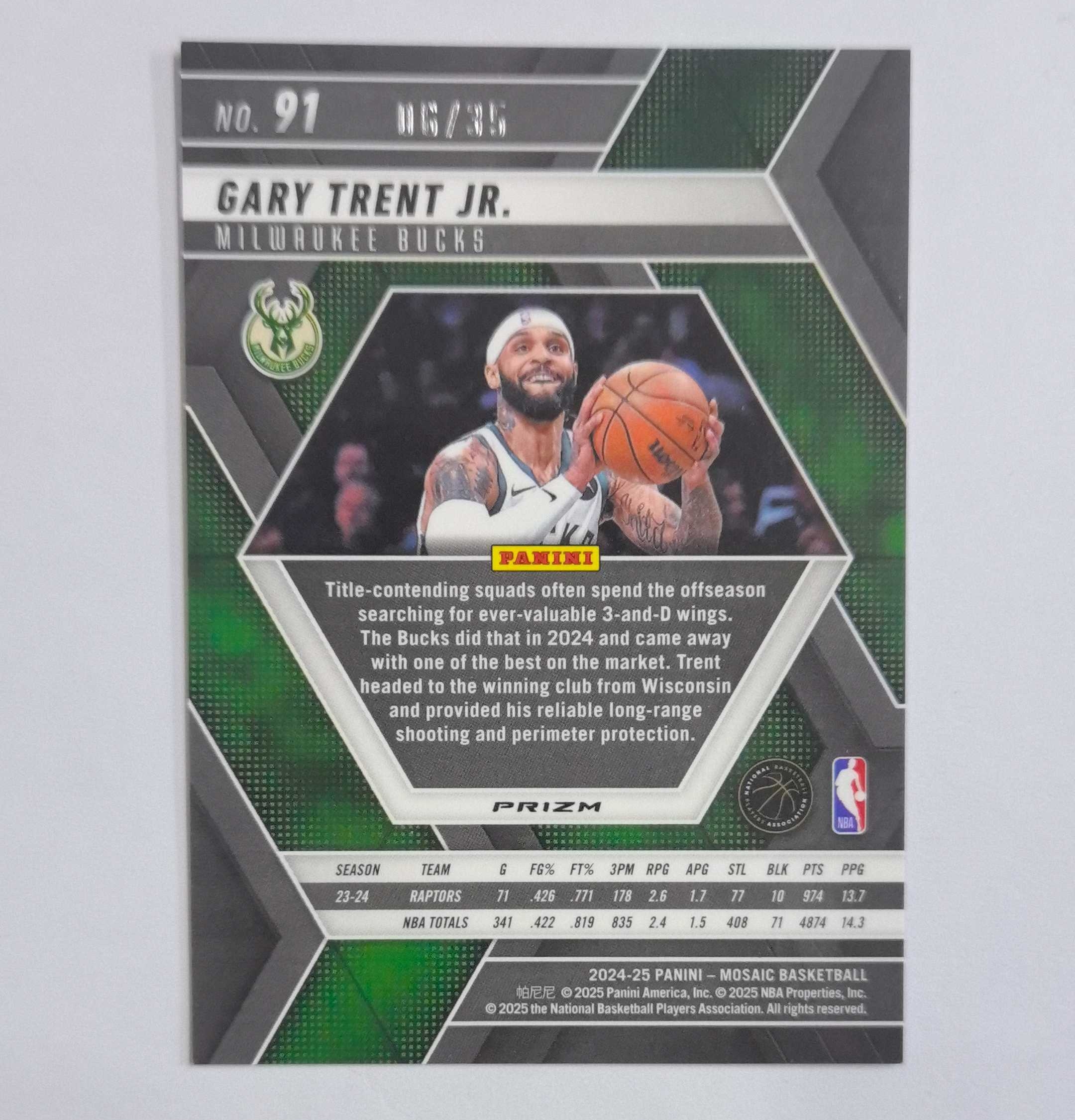 2024-25 Panini Mosaic Gary Trent Jr. 马赛克 加里特伦特 雄鹿 /35编 绿圈圈折 收藏必备