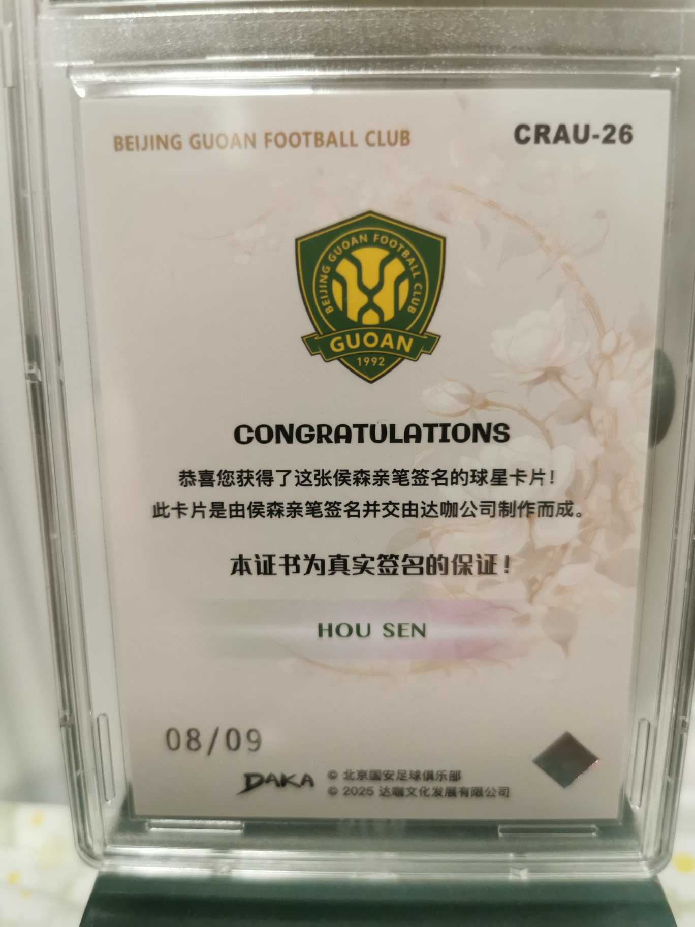 2025 DAKA 北京中赫国安足球俱乐部 侯森 北京国安队盒 侯森 中国玫瑰签名卡 金折 08/09编 低编。GBTC 评级 9/10分 实卡精美 收藏。凑套必备!