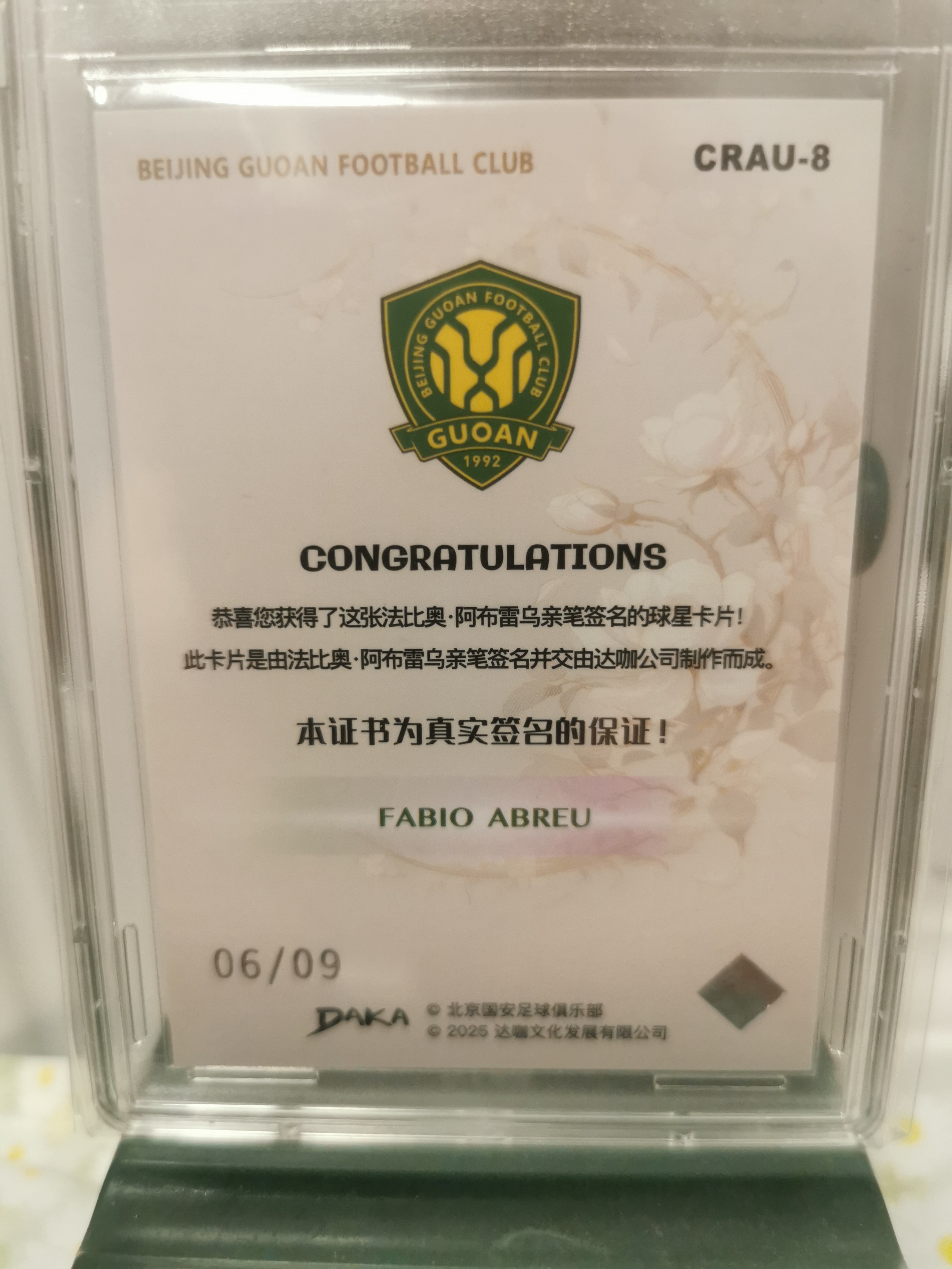 2025 DAKA 北京中赫国安足球俱乐部 法比奥 北京国安队盒 法比奥 中国玫瑰签名卡 金折 06/09编 低编 GBTC 评级 10/9分 实卡精美 收藏 凑套必备!