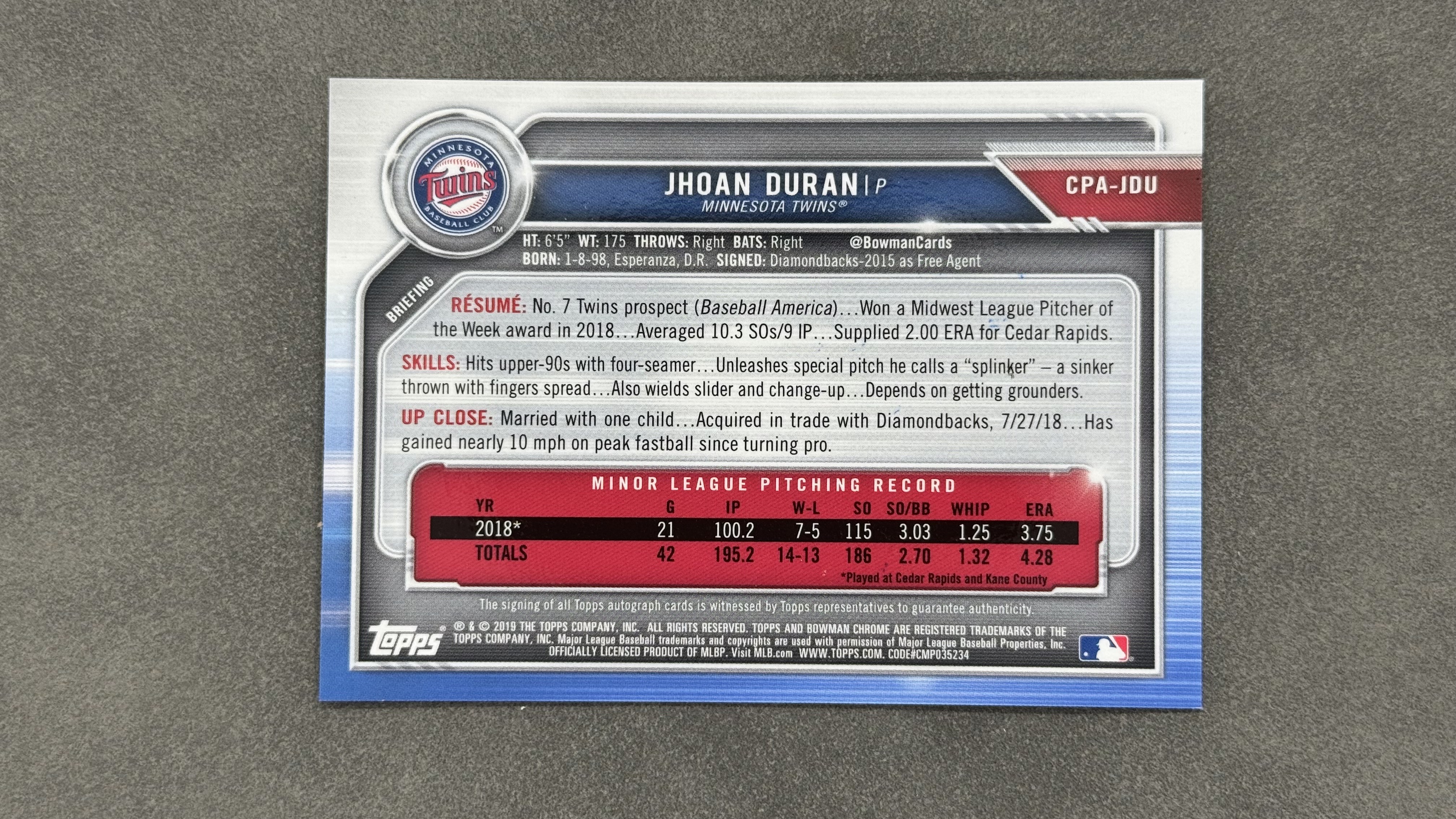 2019 Topps Bowman Jhoan Duran 1st 2025年交易至费城人 霍安·杜兰 终结者 转会后四次救援全部成功 1st新秀签字 Ebay有价 投资收藏必备 #CPA-JDU