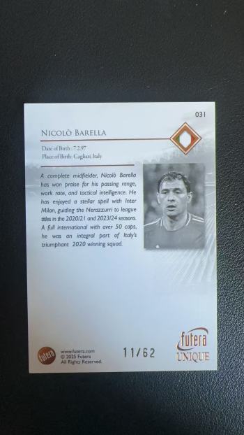 ![2025 Futera Futera Unique Nicolò Barella [年轻人球星卡]接代拍 佩奇 福特拉 意大利 巴雷拉 11/62编 不保卡品 拍前看描述](https://images.cardhobby.com/961bb59df52e38744f4b78b707b6084b1760948022779.jpg)