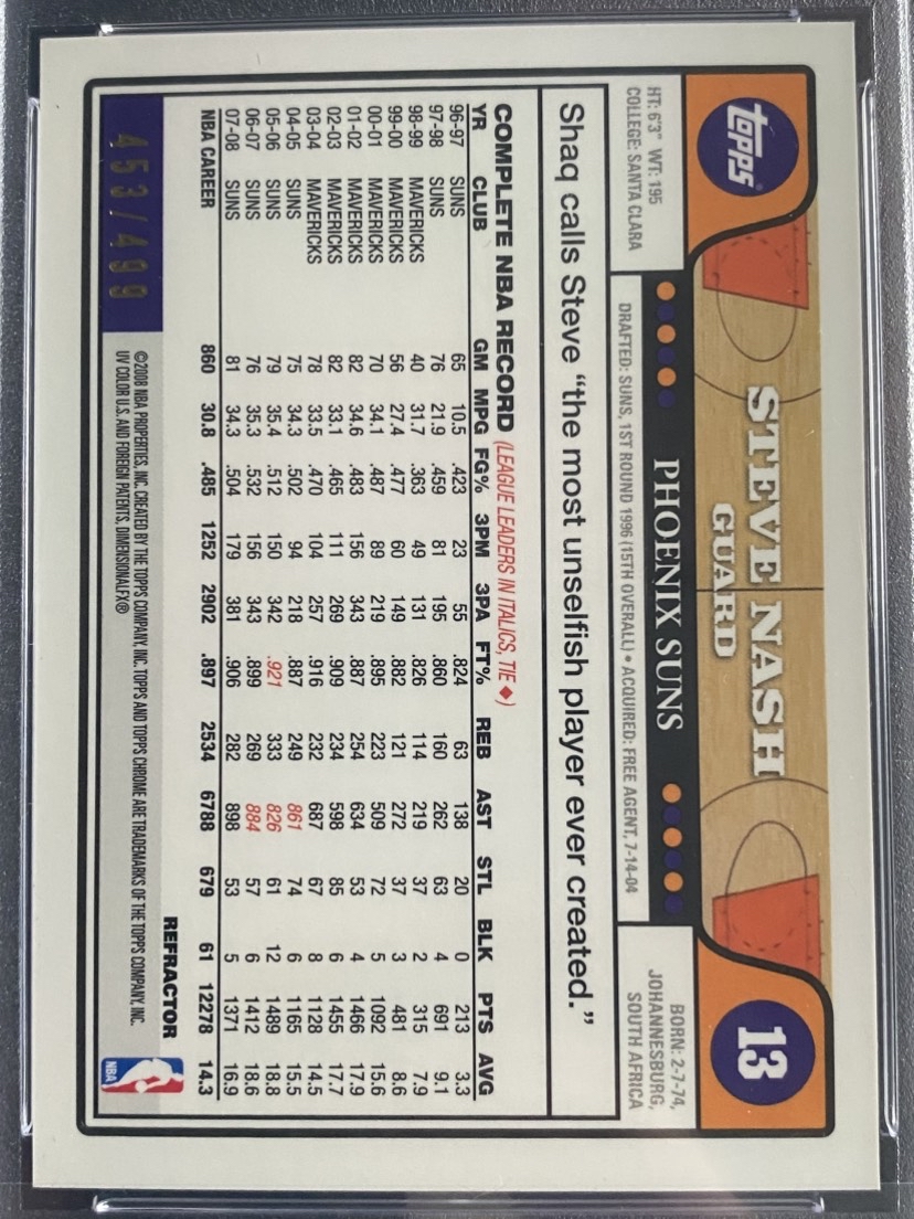 2008-09 Topps Chrome Steve Nash 斯蒂夫 纳什 最美橙折 最华丽的助攻者 /499 PSA 9分 评级