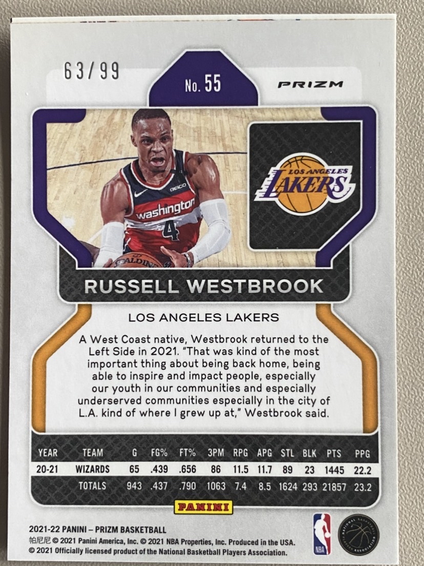 2021-22 Panini Prizm Russell Westbrook 威少 威斯布鲁克 紫折 背后有印刷线 /99