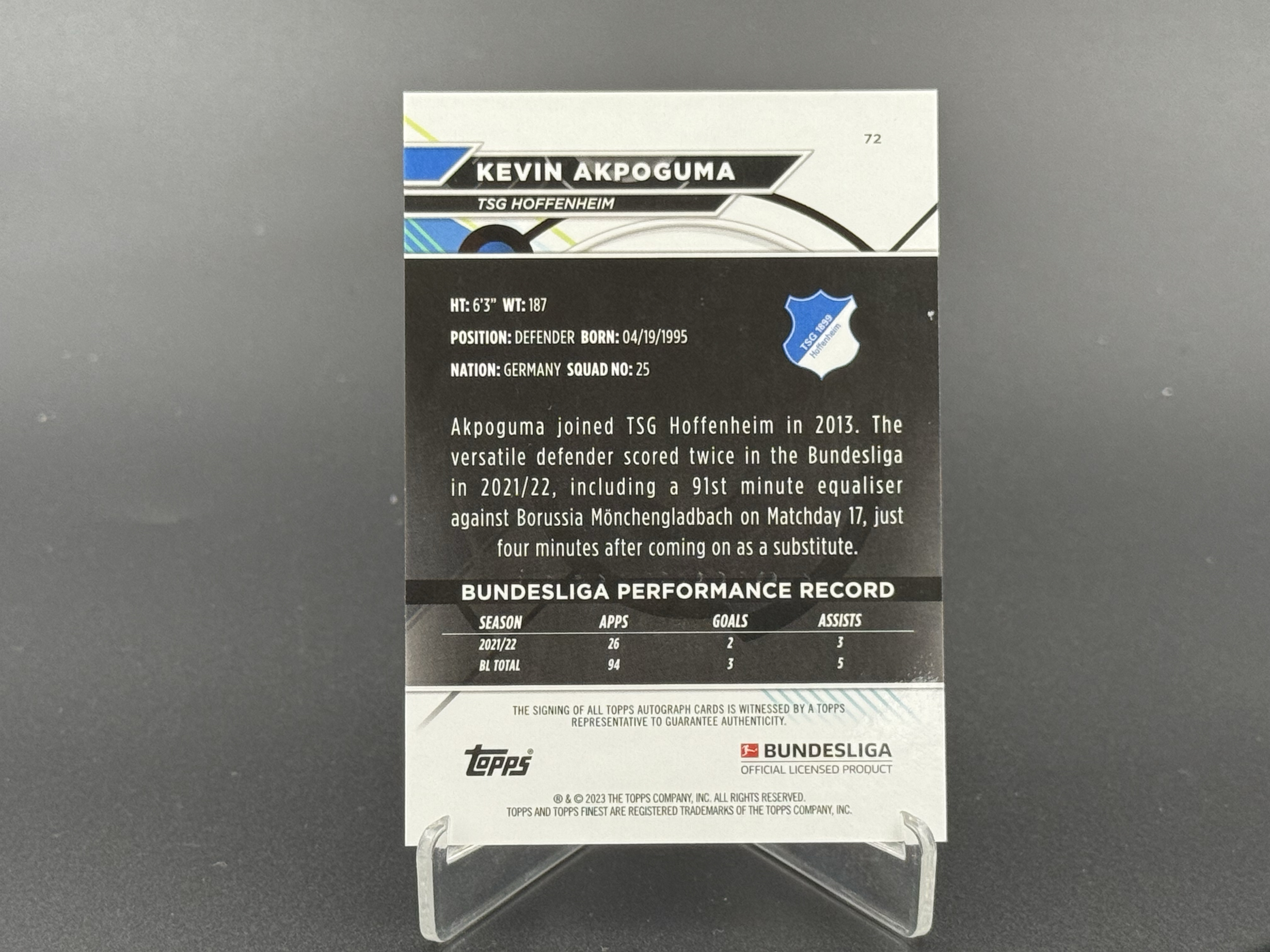 2023-24 Topps Finest Kevin Akpoguma 〖瑞慕代卖免手续费〗 凯文 阿克波古马 德甲 霍芬海姆 签字 银折 折射 墨迹如图
