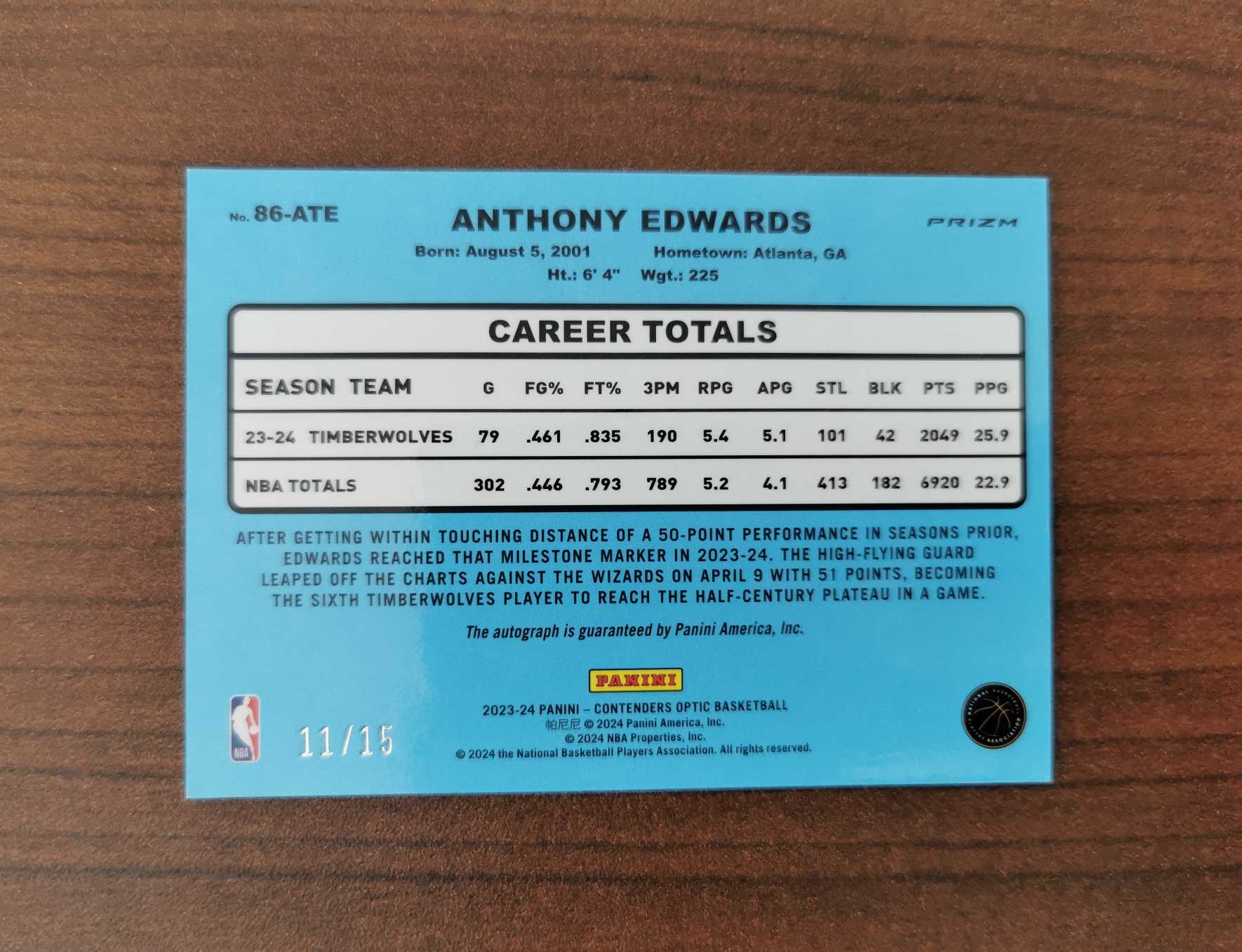 2023-24 Panini Contenders Optic Anthony Edwards 森林狼 安东尼 爱德华兹 卡签 签字 11/15编 低编 橙折 墨迹流畅 角轻微白 球队核心 球票1986
