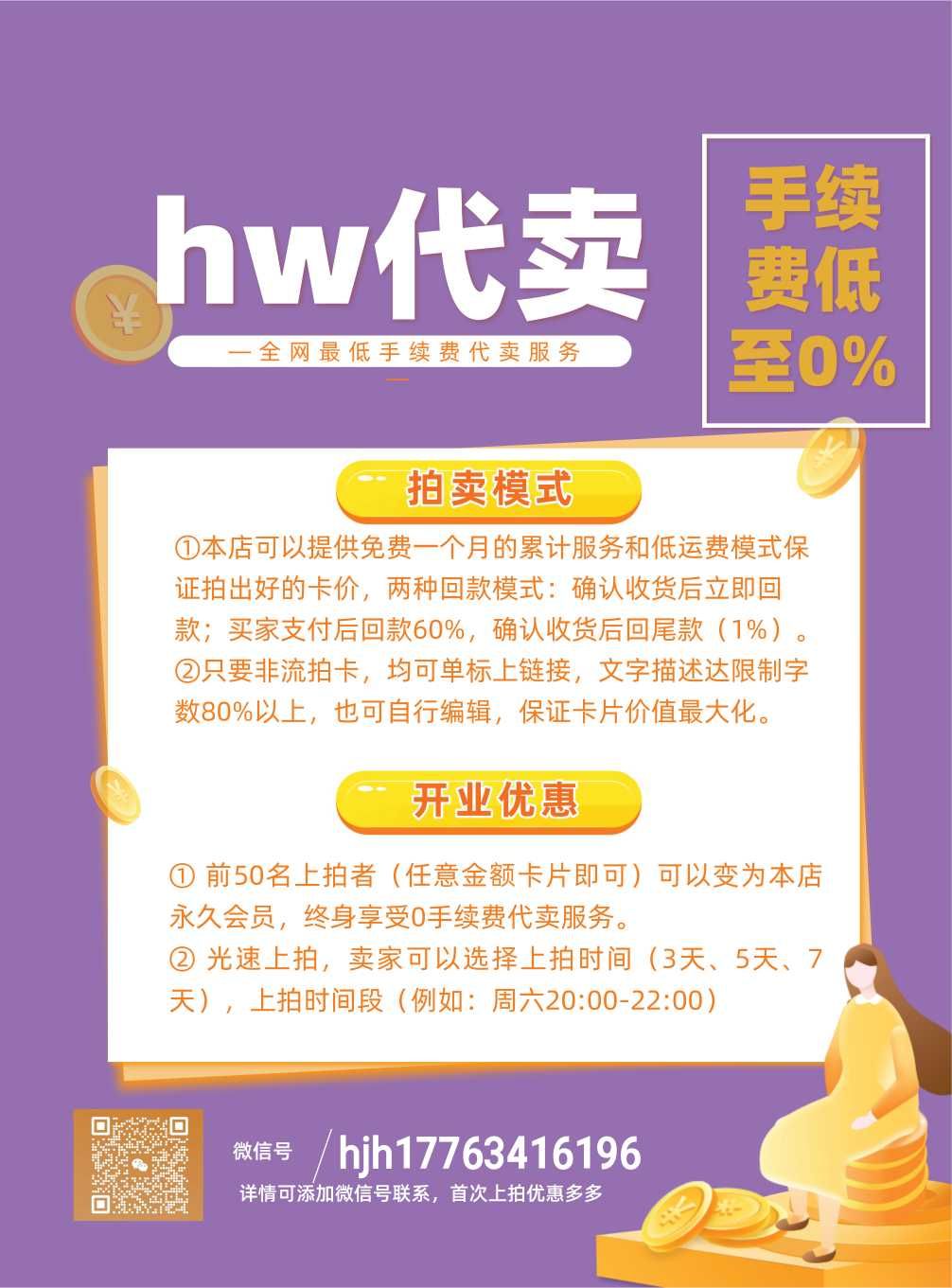 支付:拍后请与3日内进行付款,未付款者直接申诉封号处理;如需代卖可站内私信或者加v:hjh17763416196,首次联系优惠多多,手续费全网最低,低至0%。