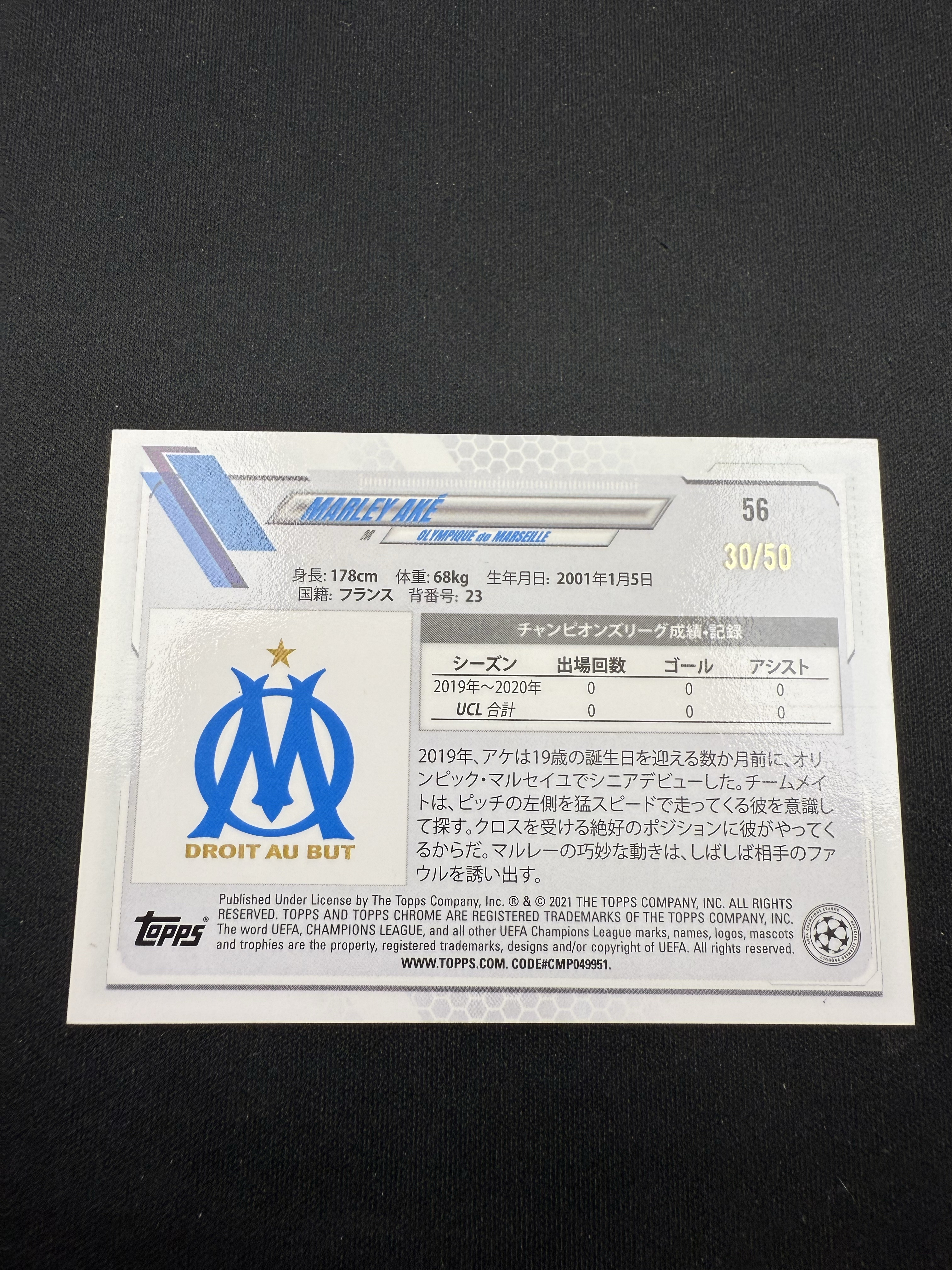 2020-21 Topps Chrome Marley Ake RC 欧冠 日版 樱花版 马赛 新秀 马利 阿克 mojo折 金折 30/50编 卡品如图
